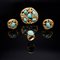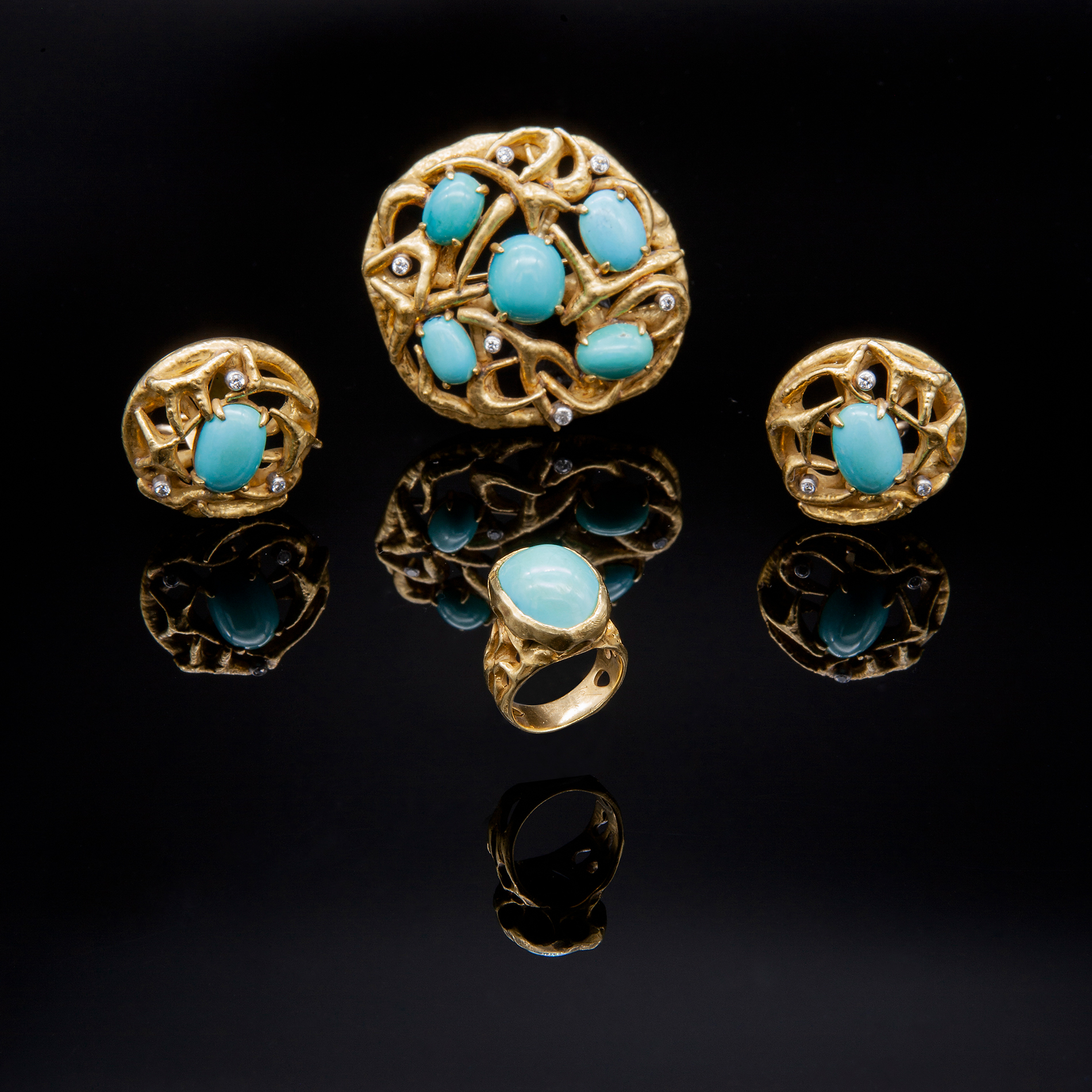Parure spilla, orecchini e anello in oro giallo, turchesi e diamanti