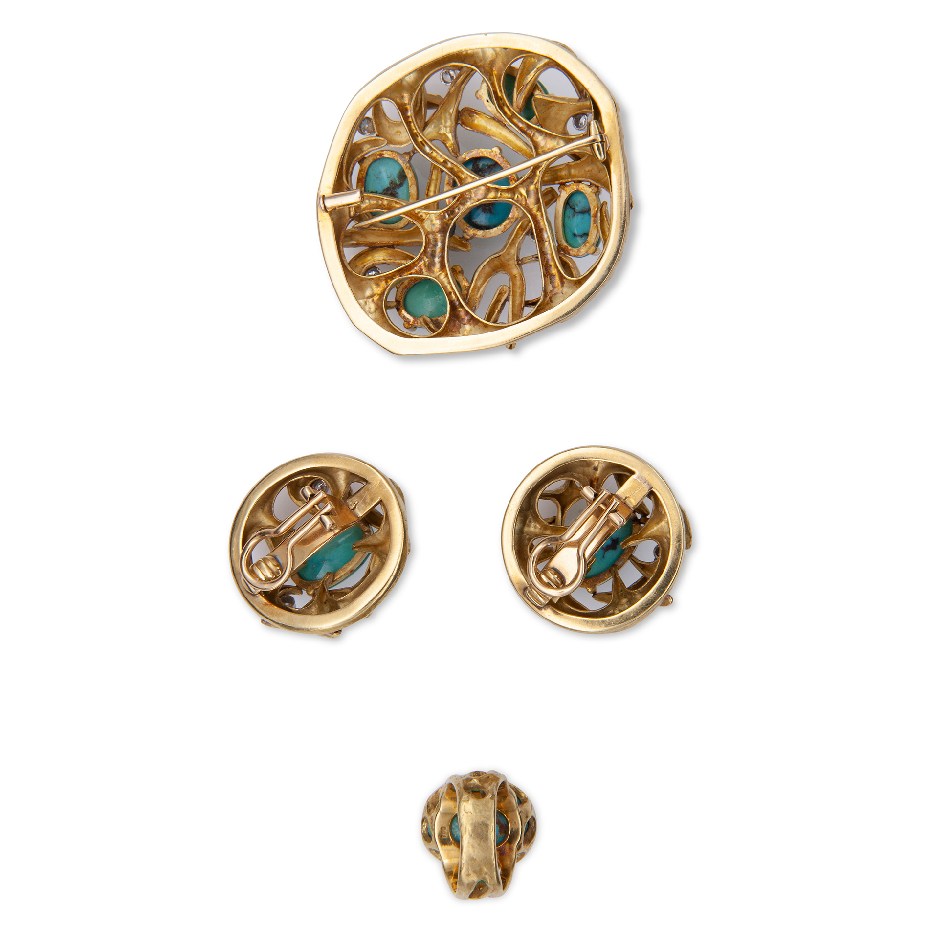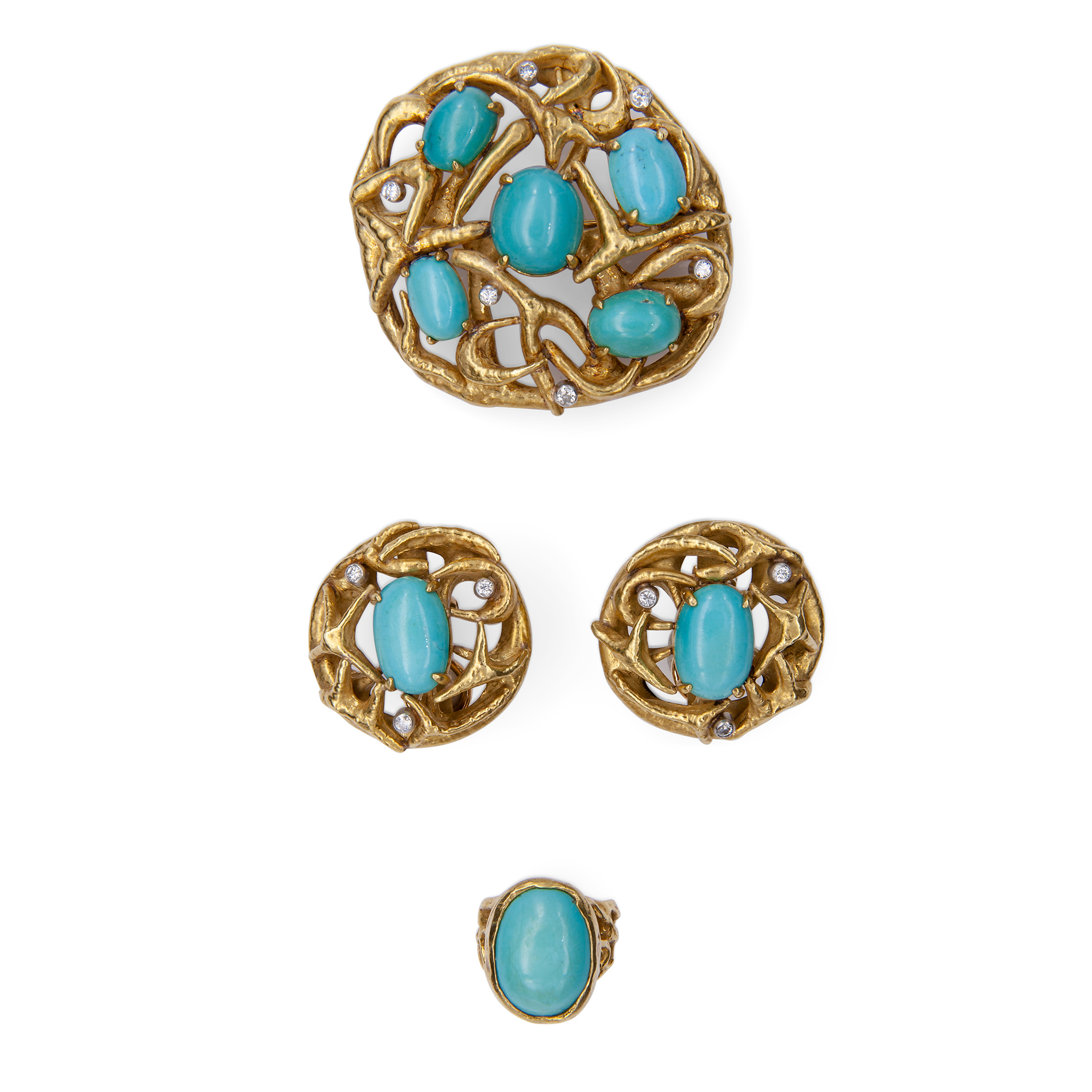 Lotto 116 | Parure spilla, orecchini e anello in oro giallo, turchesi e diamanti