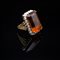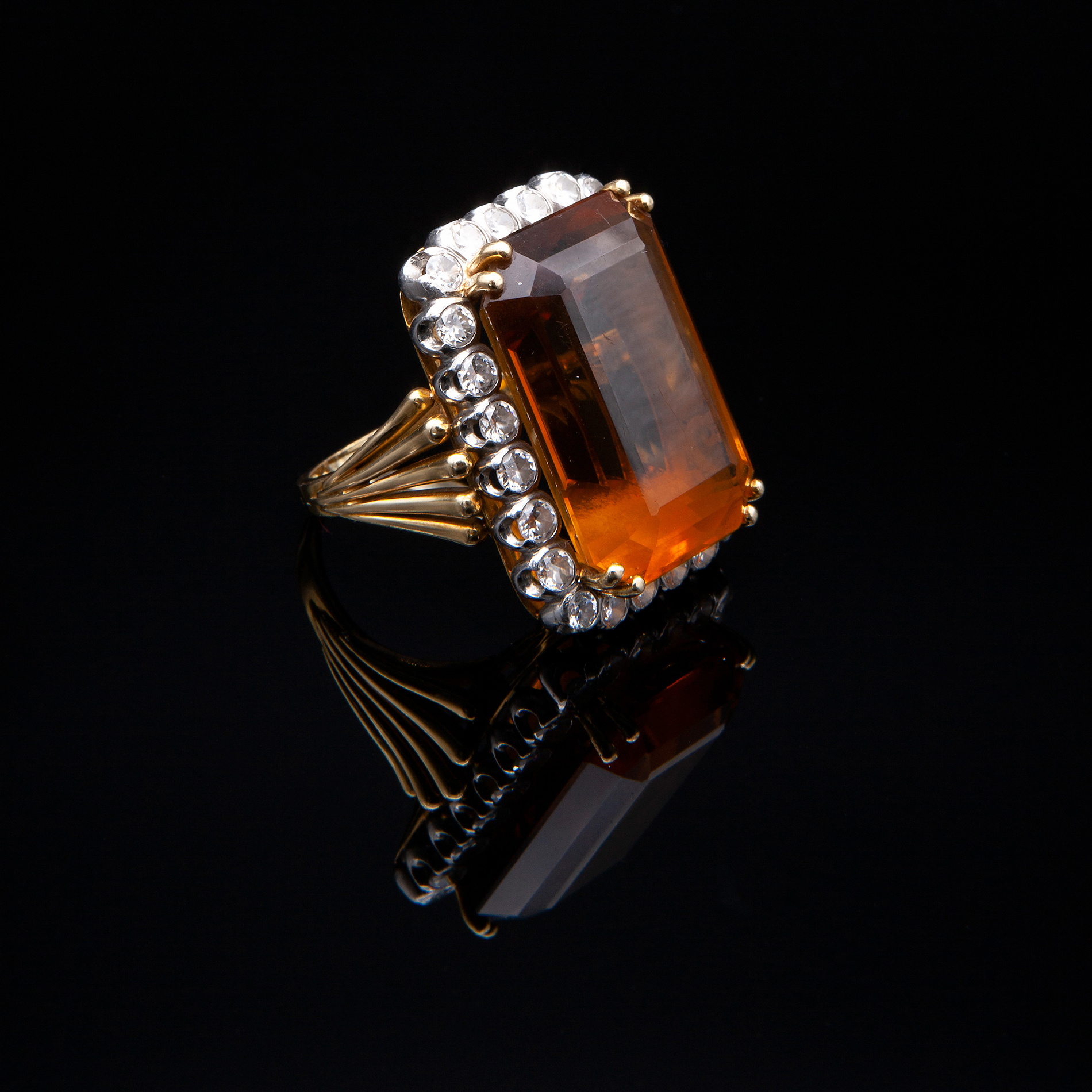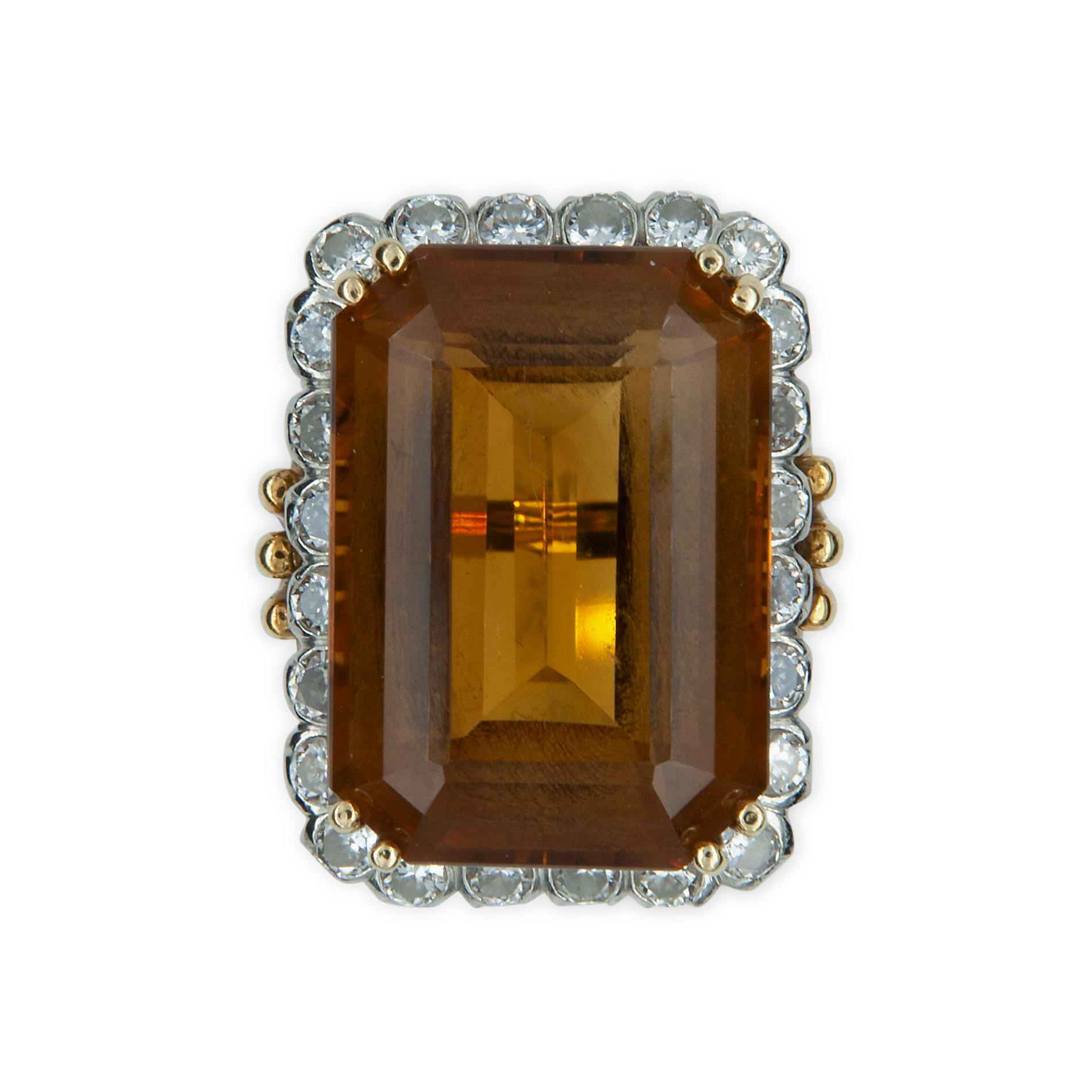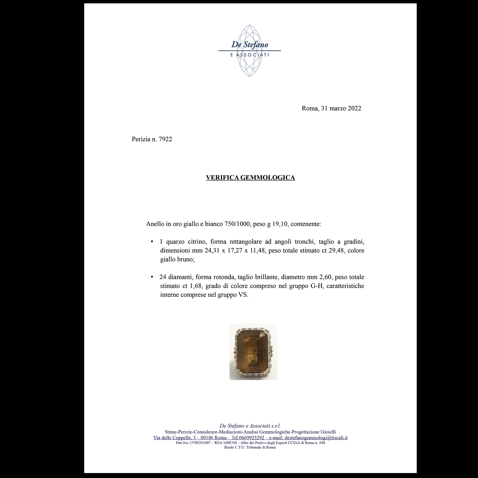 Anello in oro giallo e bianco, grande quarzo e diamanti Oro giallo e bianco 18 kt, 1 grande quarzo citrino rettangolare ad angoli tronchi, taglio a gradini, peso totale stimato 29,48 ct, 24 diamanti rotondi taglio brillante, peso totale stimato ct 1,68.