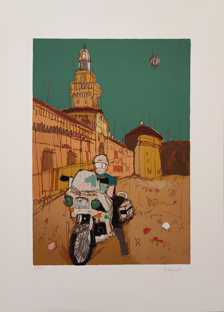 Luca Giovagnoli - Il vigile motociclista, 1995; cartella composta da n.1 litografia; firma in basso a destra, tiratura Pa in basso a sinistra.