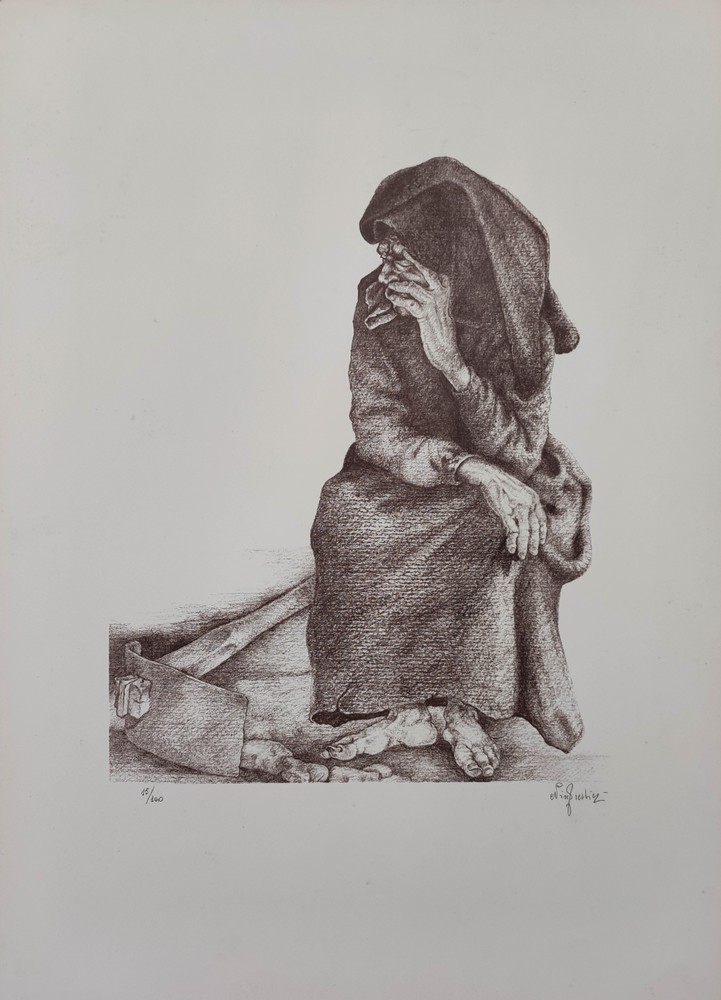 Ibrahim Kodra - Madre Teresa di Calcutta, litografia 50x70 cm; firma in basso a destra, tiratura XII/XX in basso a sinistra.
