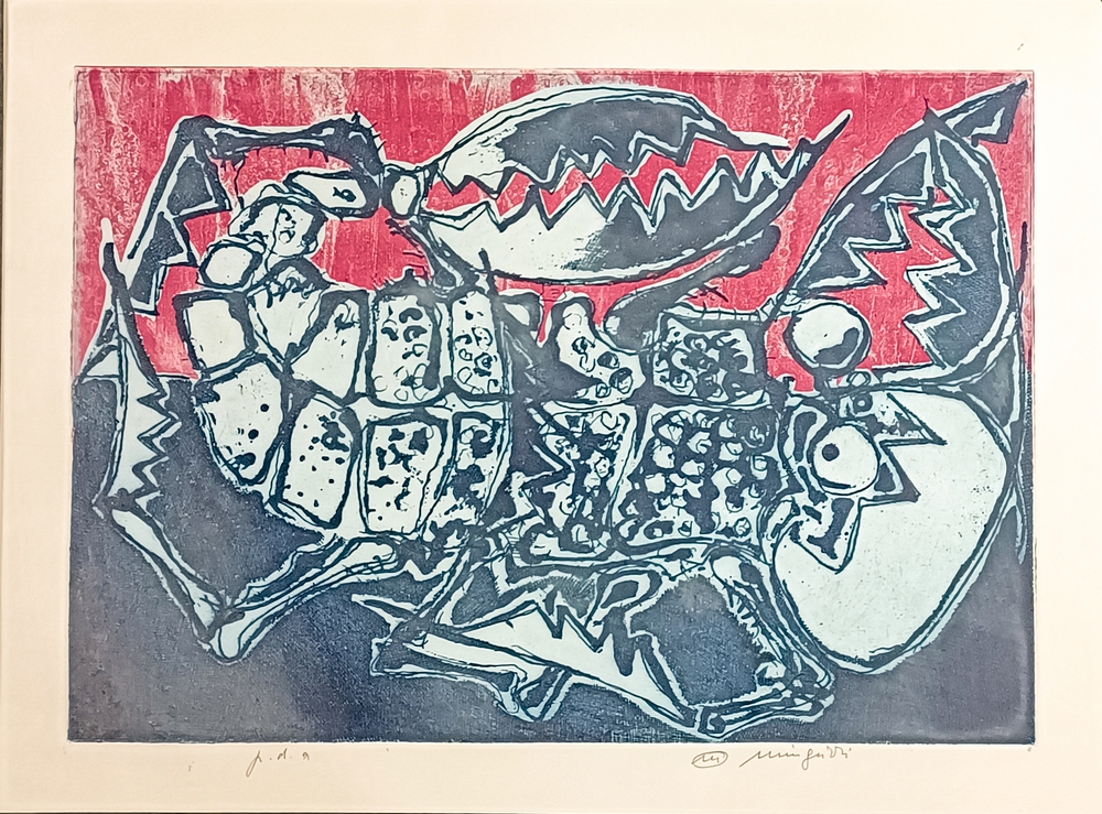 Incisione all’acquatinta 70x50 cm; firma in basso a destra, tiratura P.D.A. in basso a sinistra. Cartiglio al retro dello Studio d’Arte Farini (Bologna).