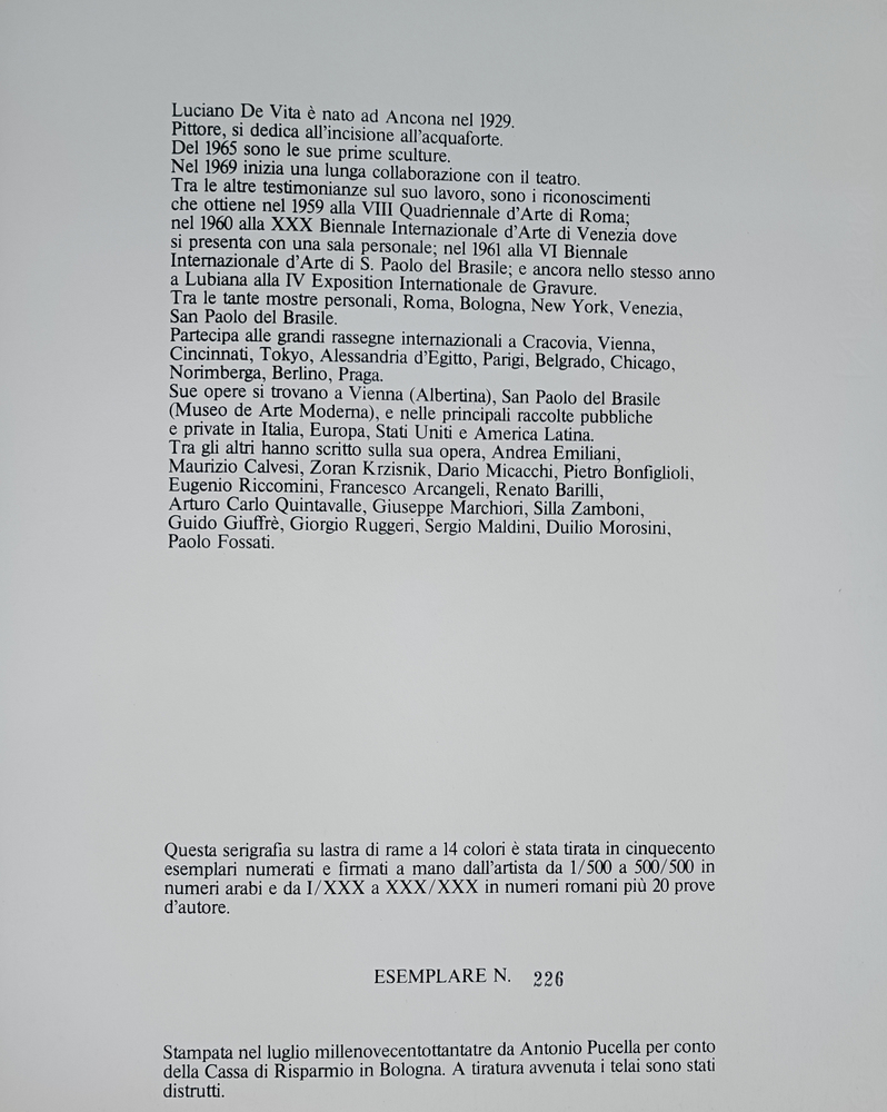 Cartella composta da n.1 serigrafia su lastra di rame 34,5x43 cm; firma anno e tiratura 179/500 in basso a destra.