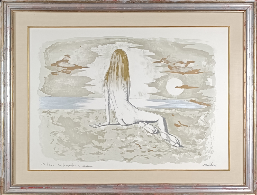Serigrafia colorata a mano 80x60 cm; firma in basso a destra, tiratura 68/100 in basso a sinistra.
