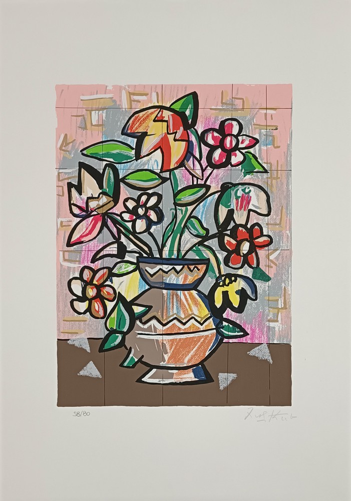 Ibrahim Kodra - Vaso di fiori, litografia 35x50 cm; firma in basso a destra, tiratura 58/80 in basso a sinistra.