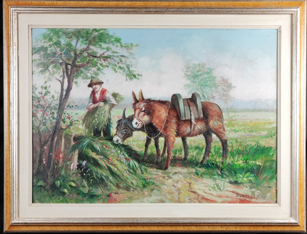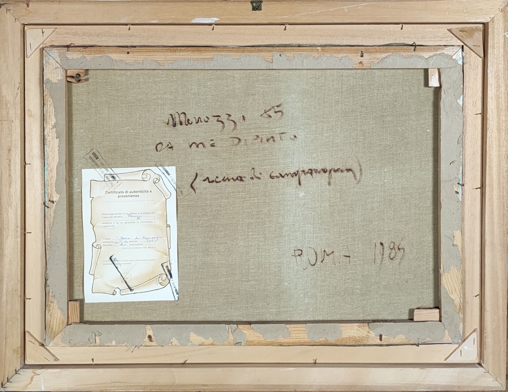 Olio su tela 50x70 cm; firma in basso a destra, firma, anno, cartiglio della Galleria Il Tempo (Roma) e autentica dell'artista al retro.