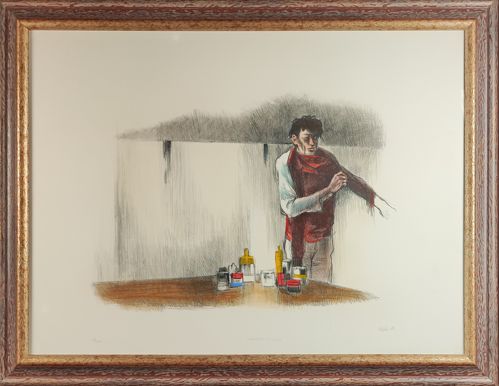 Litografia pastellata su carta 65x87 cm; firma in basso a destra, tiratura 57/120 in basso a sinistra.