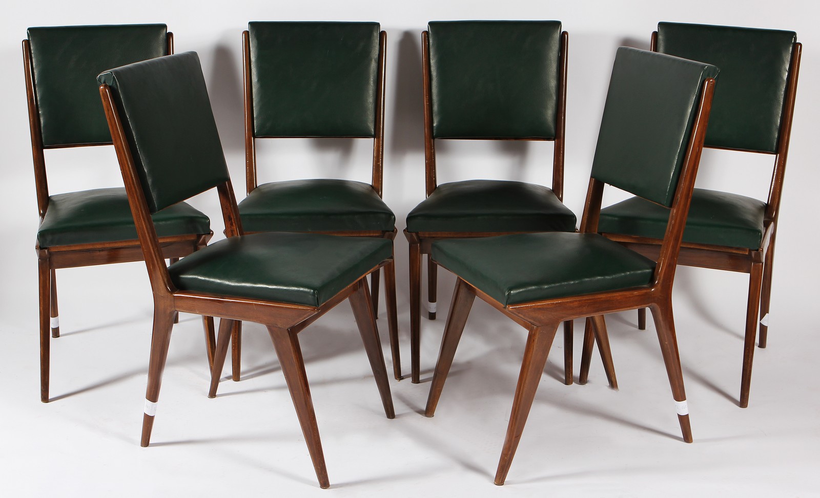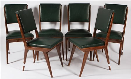 DE CARLI CARLO (1910 - 1999) Sei sedie. Legno e skai. Cm 57,00 x 89,00 x 44,00. Anni '50.