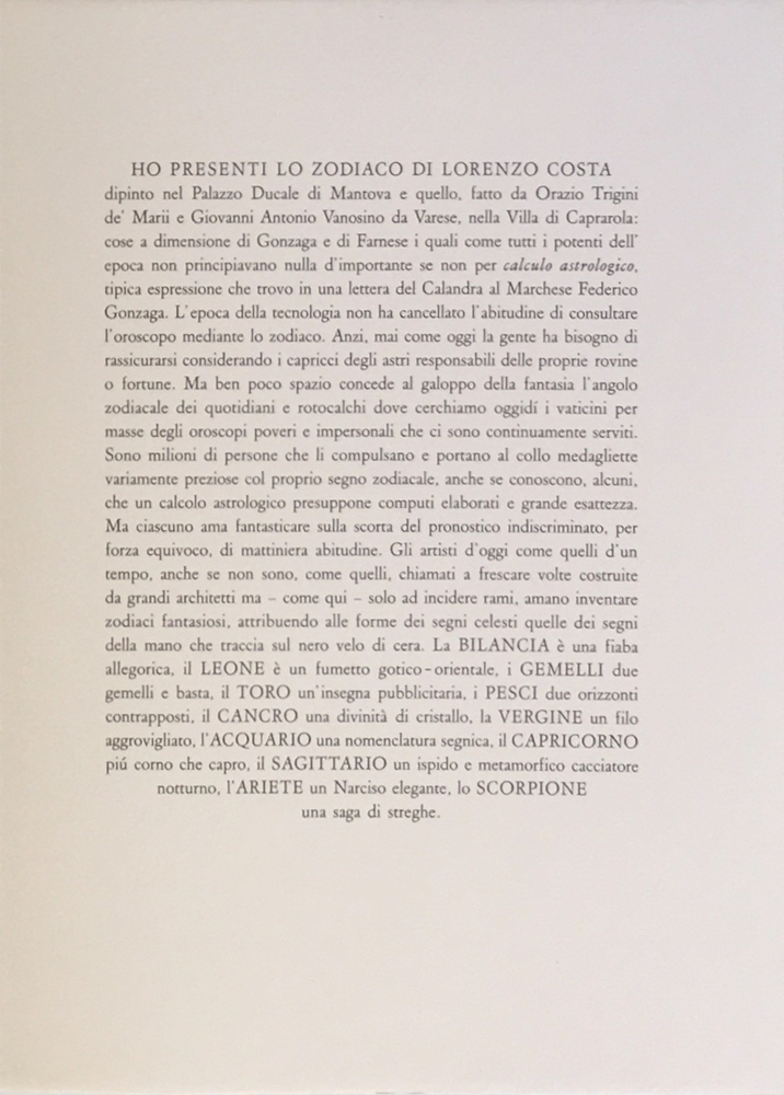 Cartella composta da n. 12 acquaforti 65x45 cm, firmate e numerate 54/115, rispettivamente: Abacuc - Capricorno Mosconi Lodovico - Acquario Margonari Renzo - Pesci Crippa Luca - Ariete Girardello Silvano - Toro Zanon Ada - Gemelli Atza Antonio - Cancro Radicioni Massimo - Leone Treccani Ernesto - Vergine Sommaruga Renzo - Bilancia Vallazza Marcus - Scorpione Tomiolo Eugenio - Sagitario Edizioni d'arte Del Torchio D'Amore (Verona).
