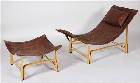 DAL LAGO ADALBERTO (n. 1936) Chaise long con puff. 1973. Metallo e pelle. Cm 117,00 x 67,00 x 57,00. Dimensioni puff: cm 60x56x36.
