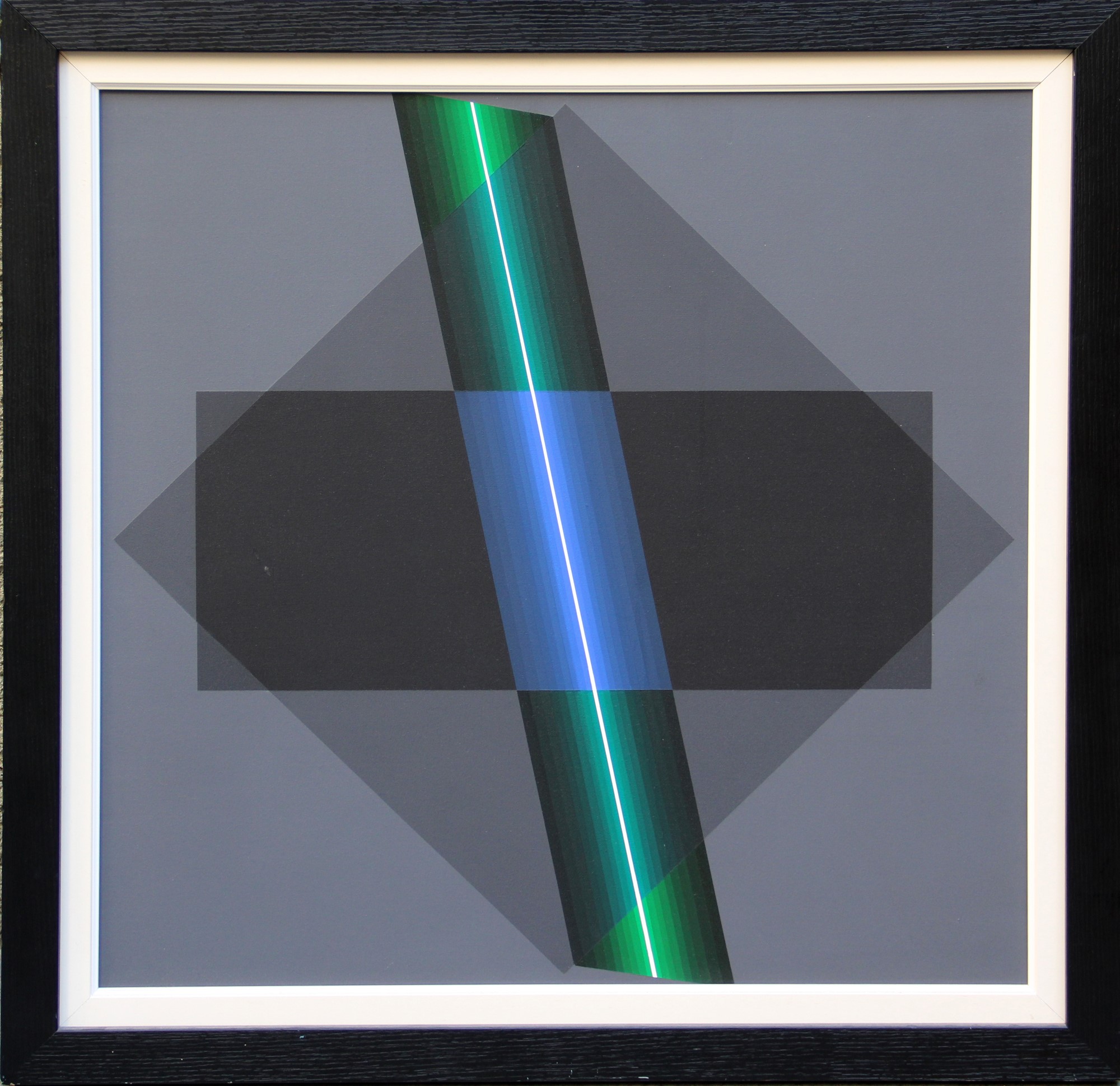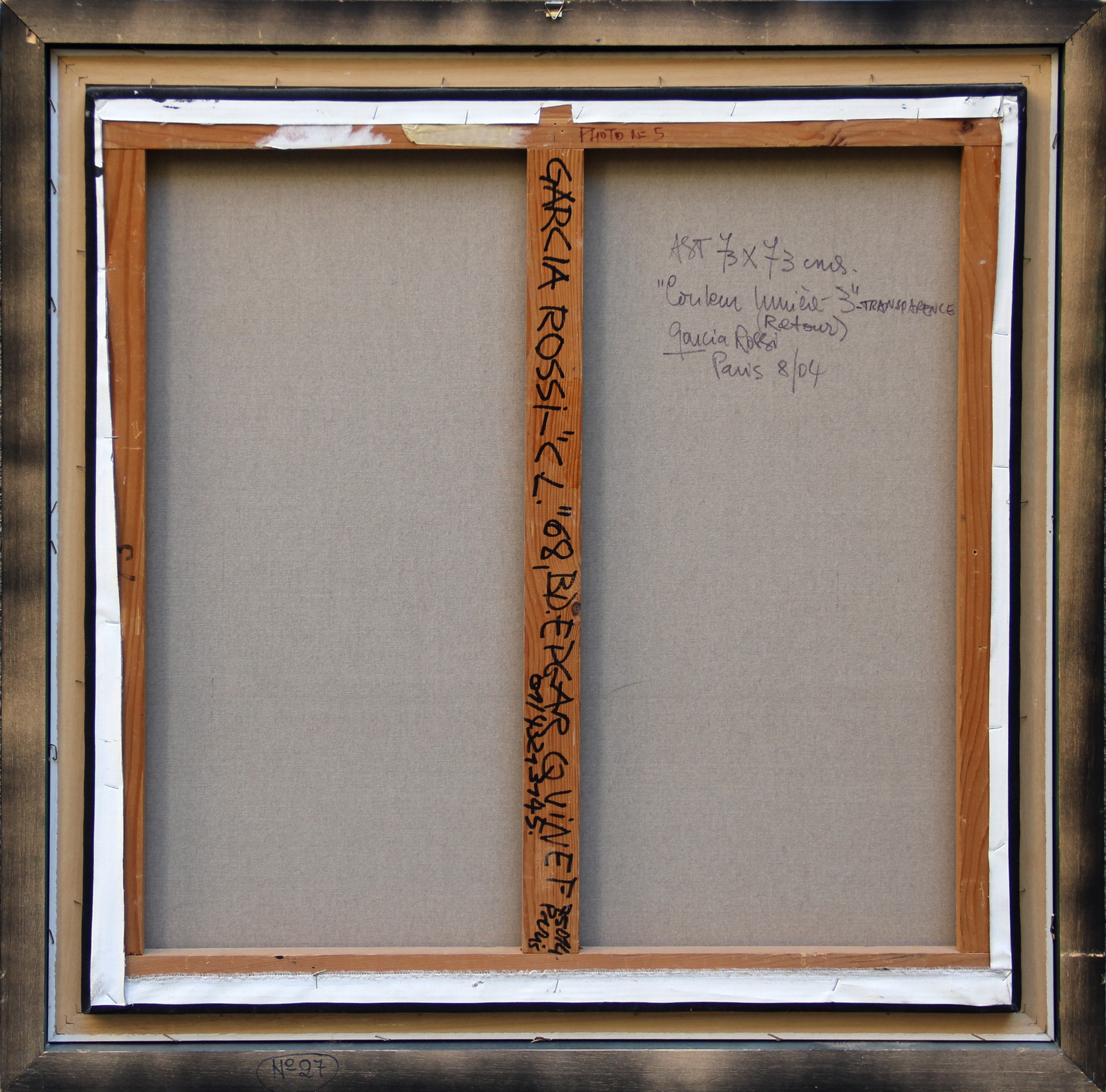 Misure, titolo, scritta, firma, luogo, data "AST 73x73 cms, Carlem lumiére-3, transparence (Retour), Garcia Rossi, Paris 8/04" (al retro)