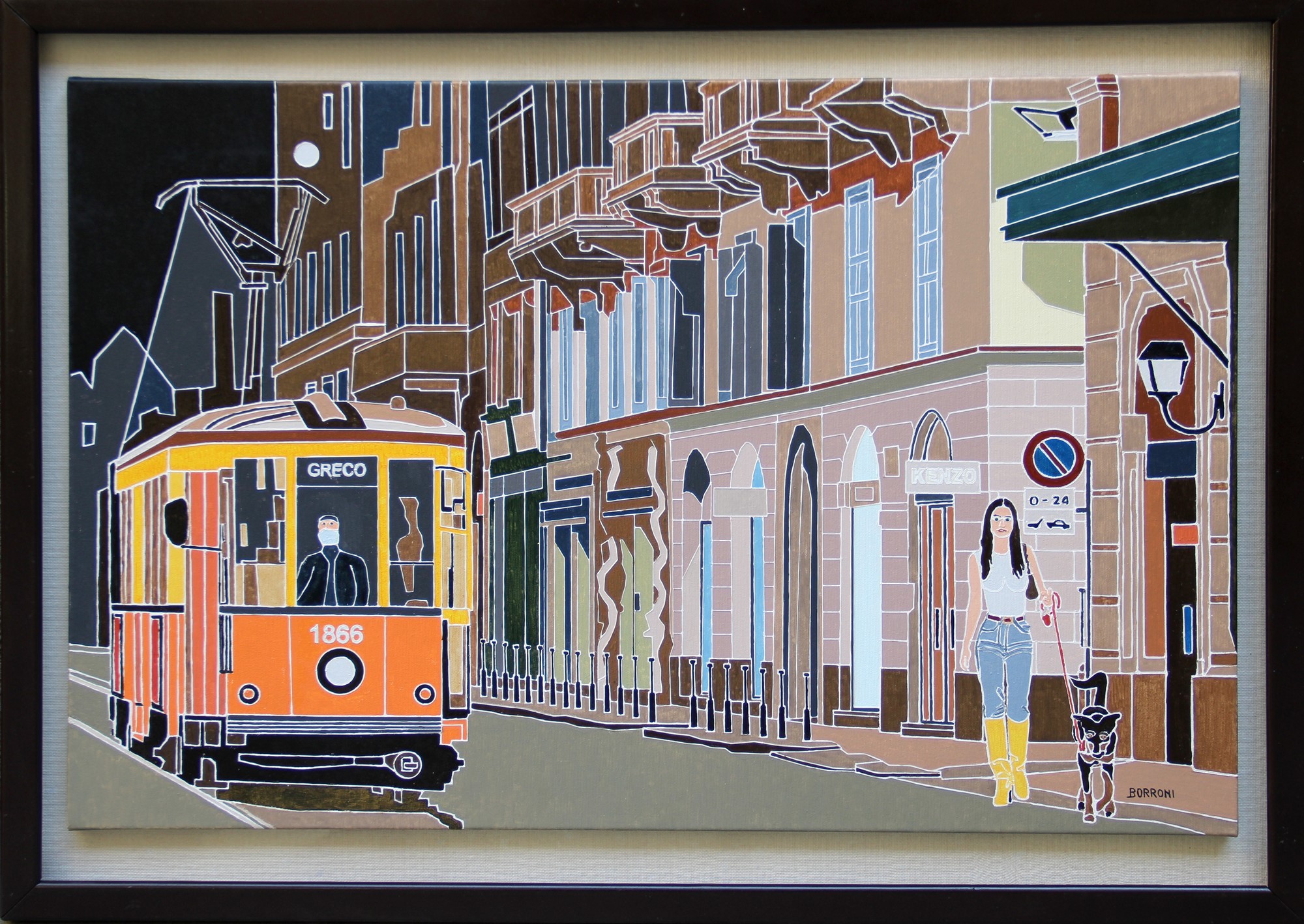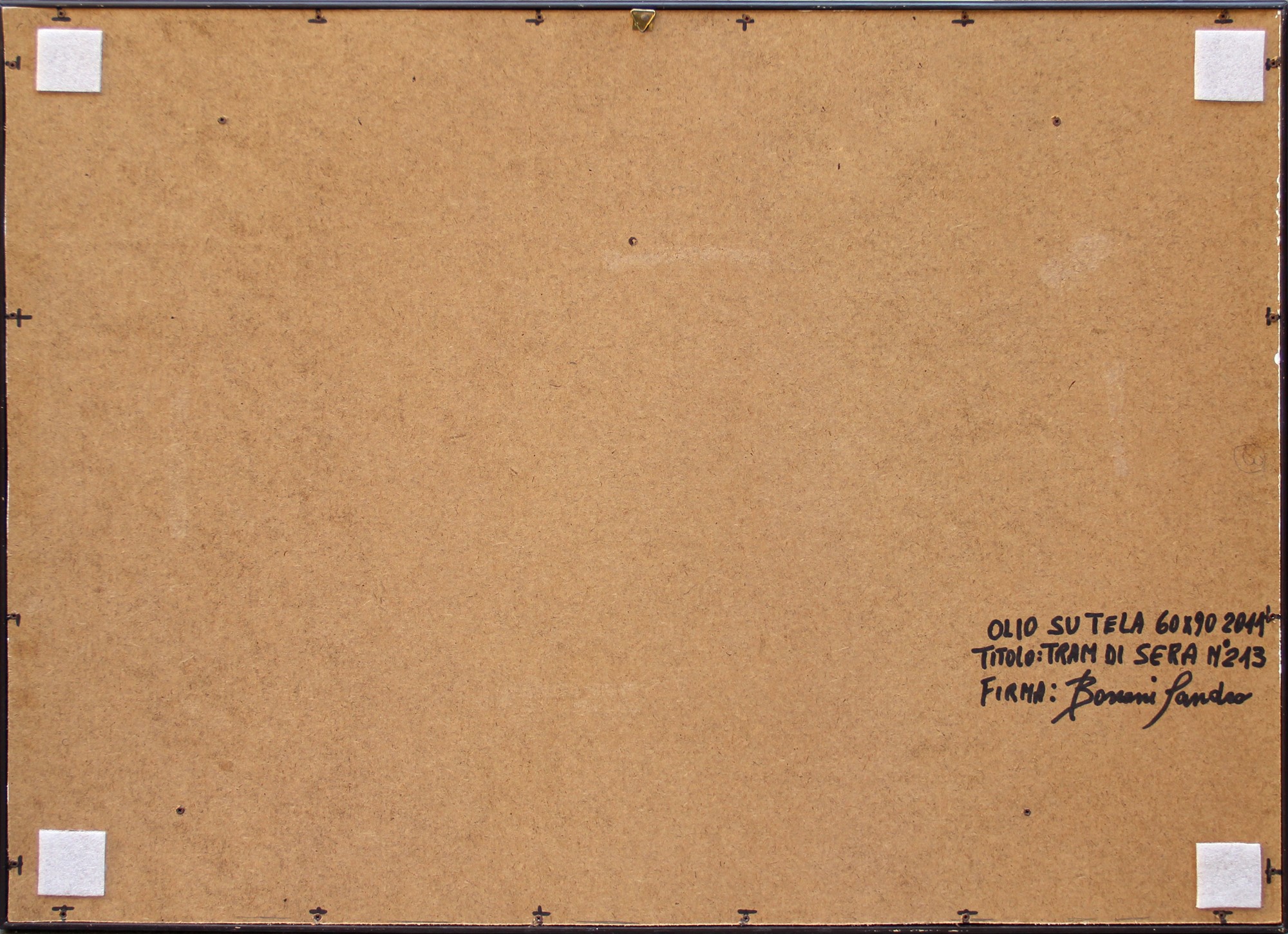 Tecnica, misure, data, titolo, numerazione, firma "Olio su tela, 60x90, 2021, Tram di sera, n. 213, Borroni Sandro" (al retro)
