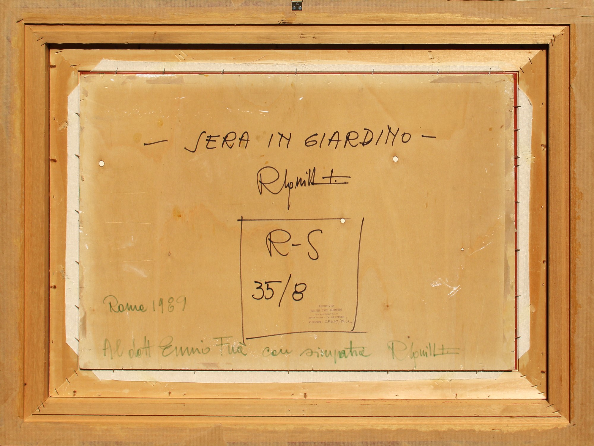 Titolo, firma, numerazione, dedica "Sera in giardino, R. Squillantini, R-S 35/8";