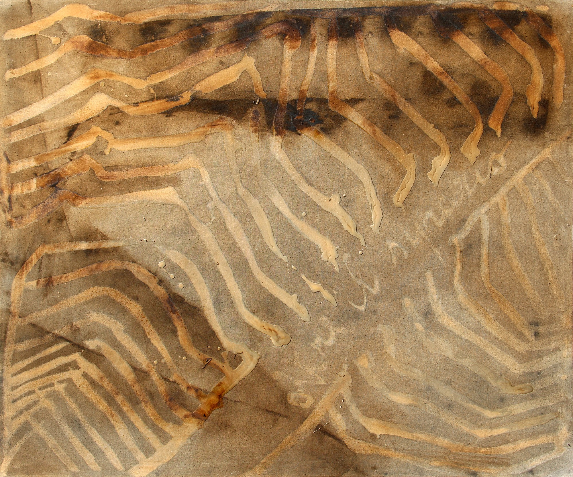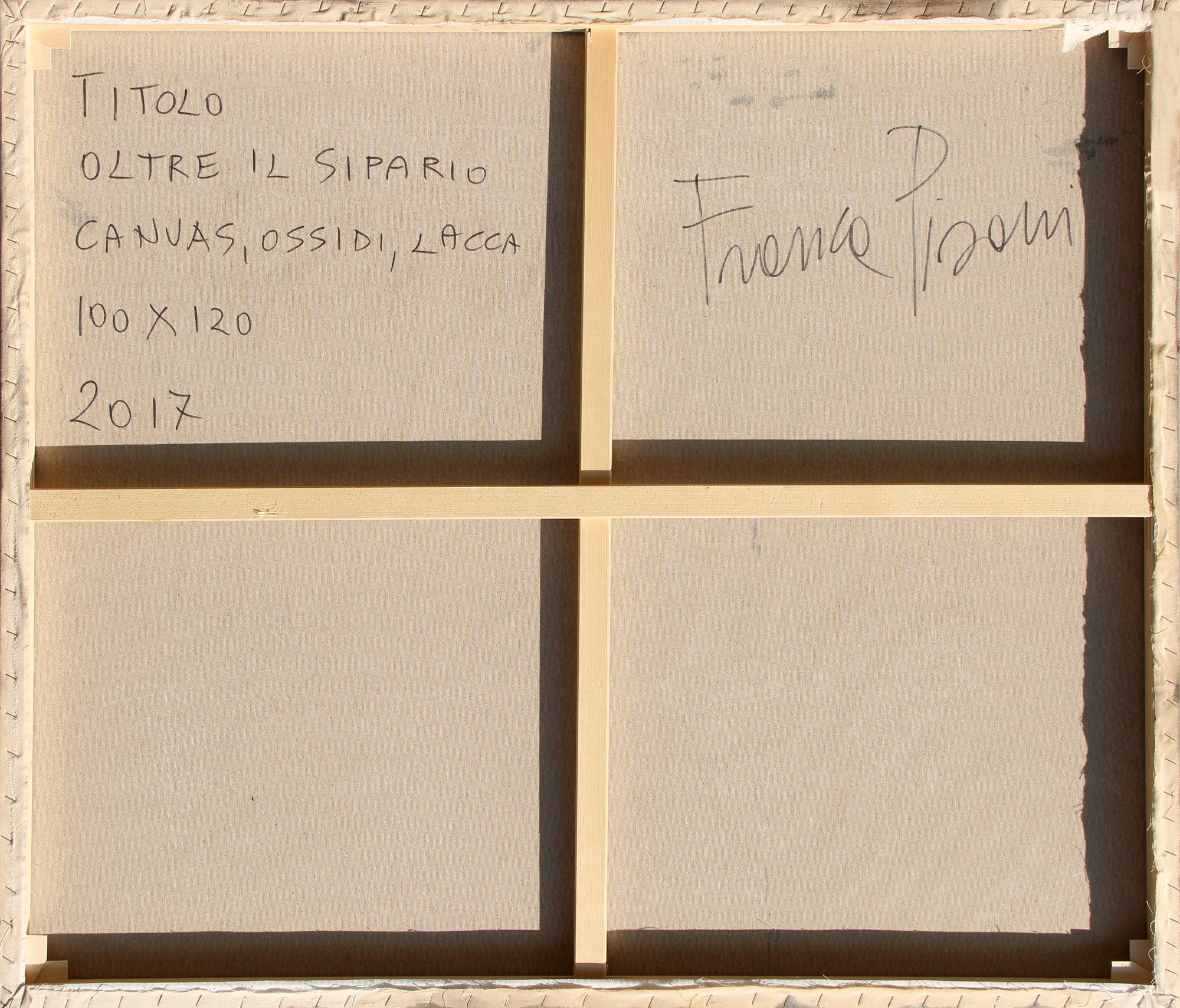 Titolo, tecnica, misure, data, firma "Oltre il sipario, canvas, ossidi, lacca, 100x120, 2017, Franca Pisani" (al retro)