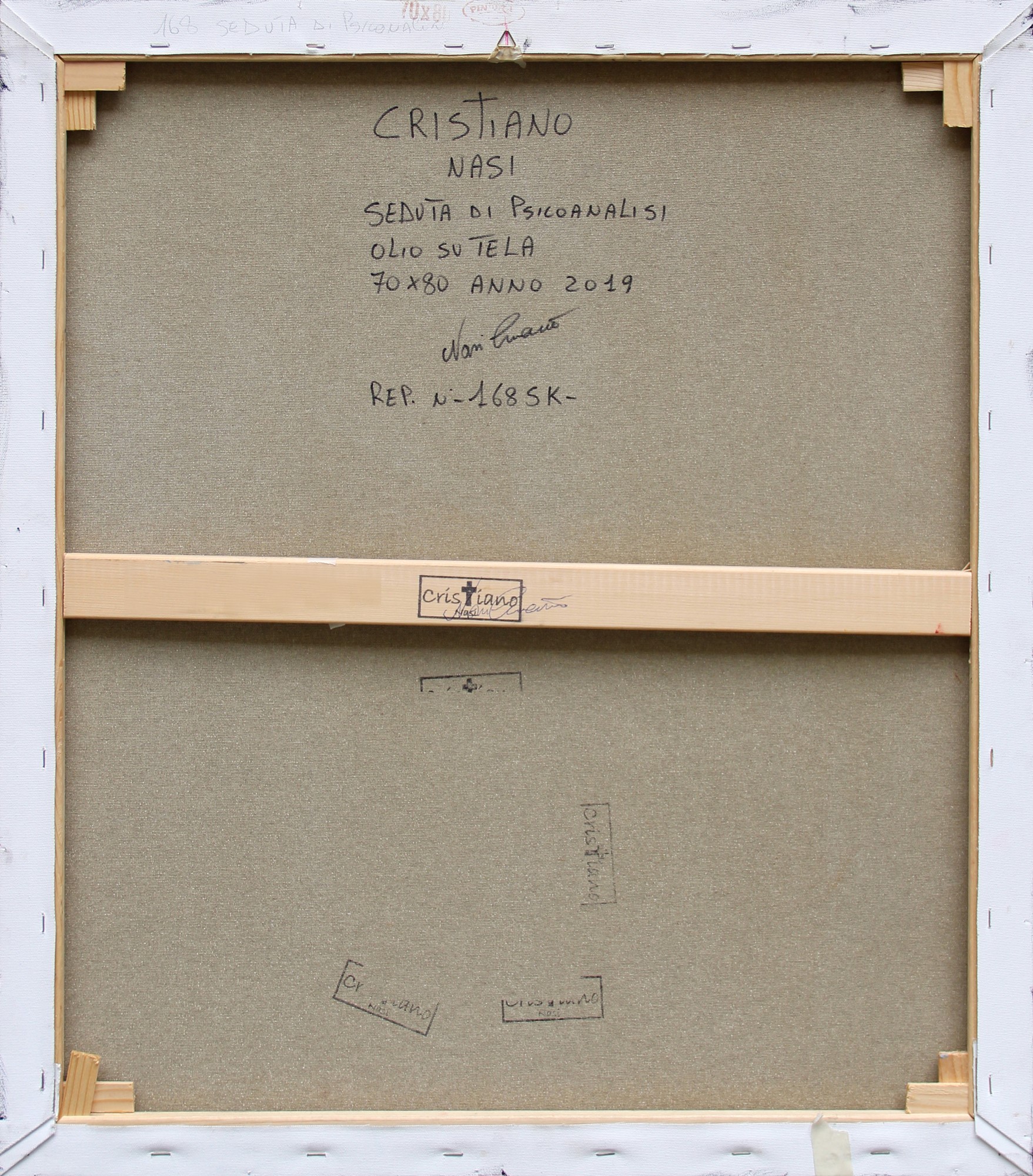 Firma, titolo, tecnica, misure, data, firma, numerazione "Cristiano Nasi, Seduta di psicoanalisi, olio su tela, 70x80, 2019, Nasi Cristiano, rep. n. 168SK";