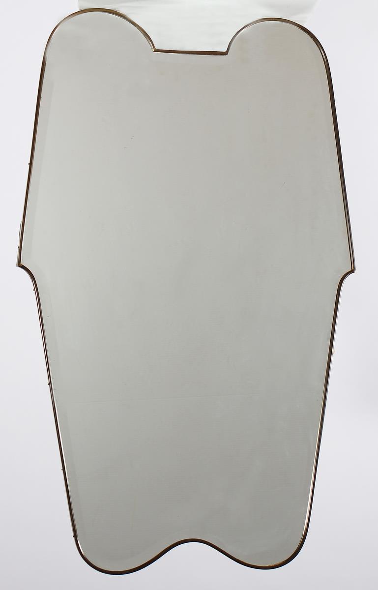 MANIFATTURA ITALIANA DEL XX SECOLO Specchio sagomato e bisellato. Ottone e vetro. Cm 69,00 x 111,00 x 2,50. Anni '50. Cornice in ottone.