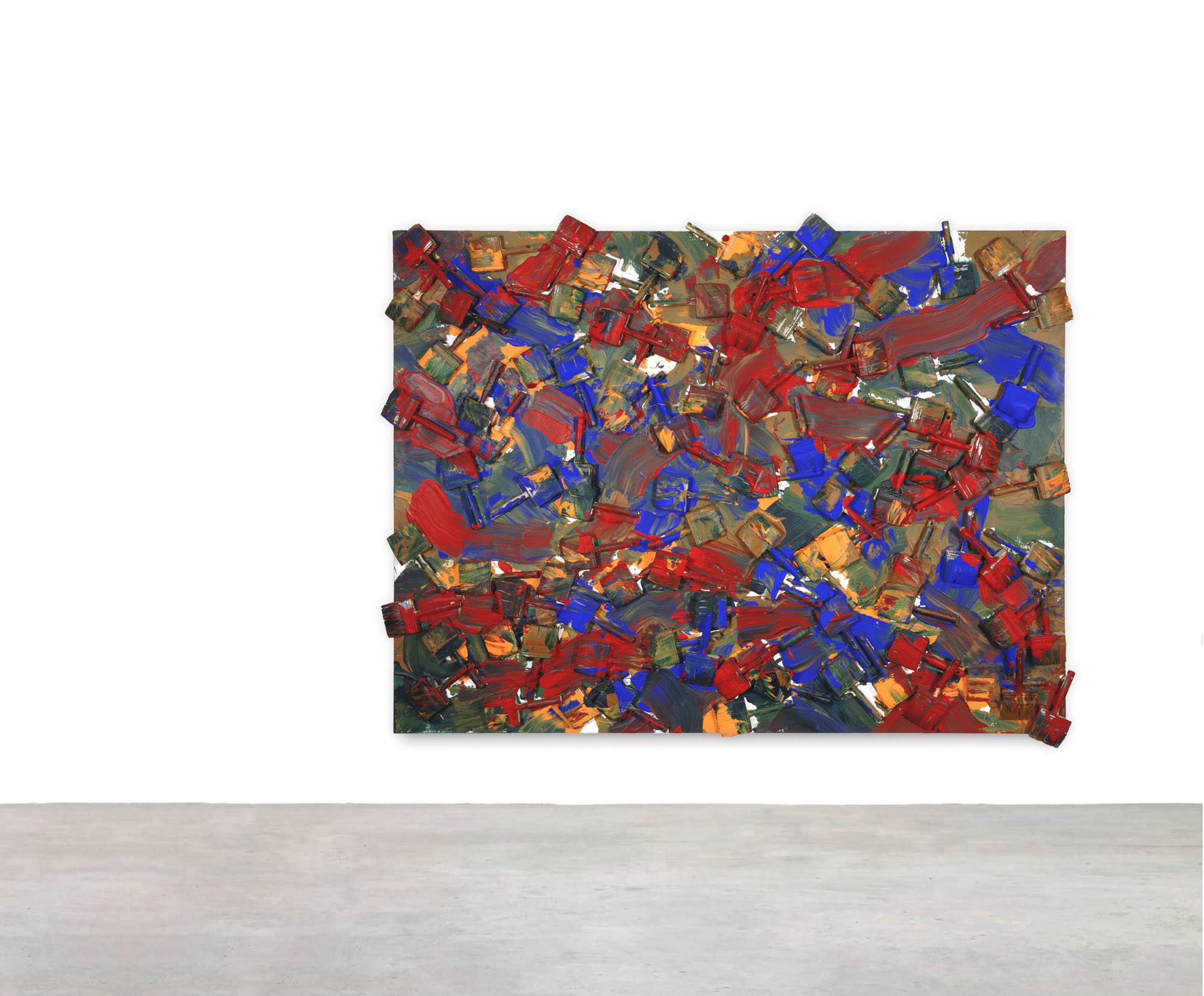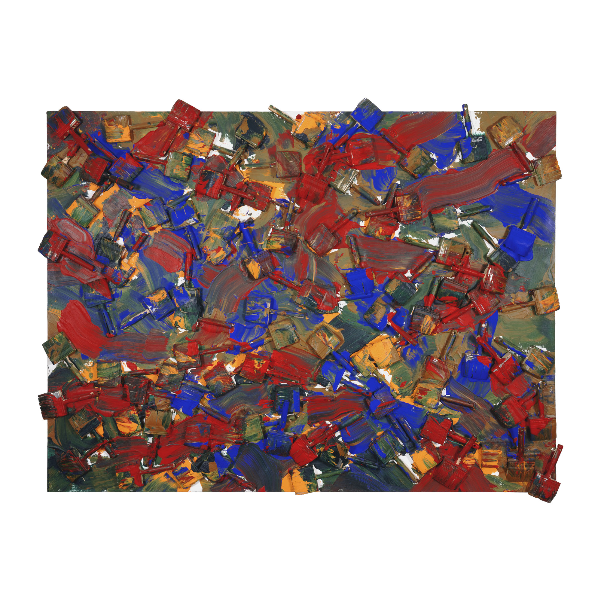 Accumulazione di pennelli e colori acrilici misti su tela riportati su tavola