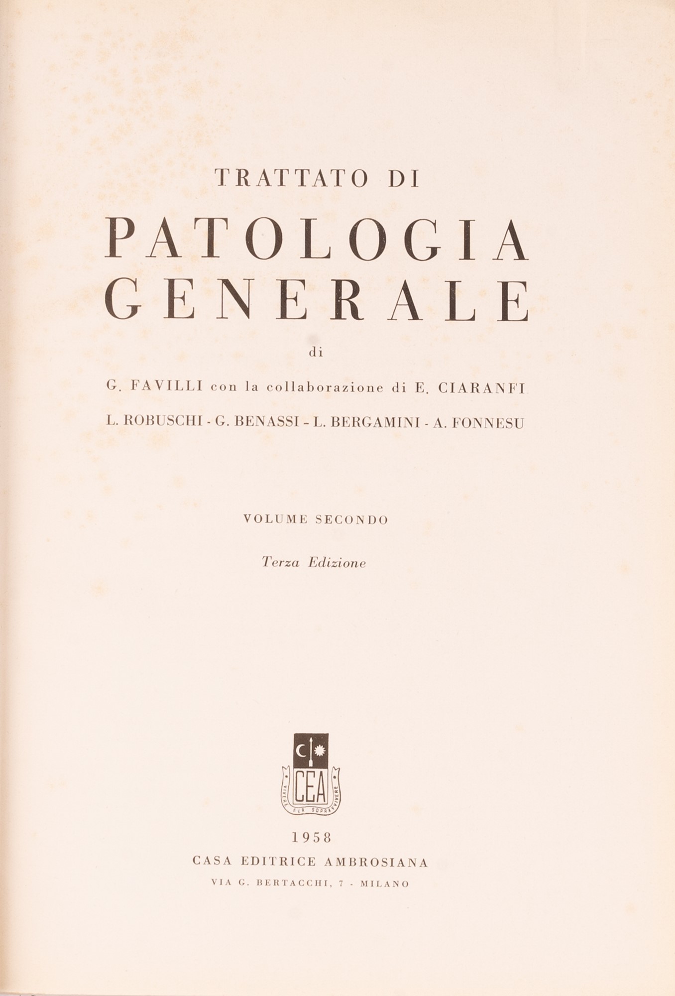 a) Favilli G. e Collaboratori. Trattato di Patologia Generale III Edizione . Milano, 1958. due volumi in edizione telata. dedica autografa dell'autore. pgg. XXXII- 1876con 501 fgg;