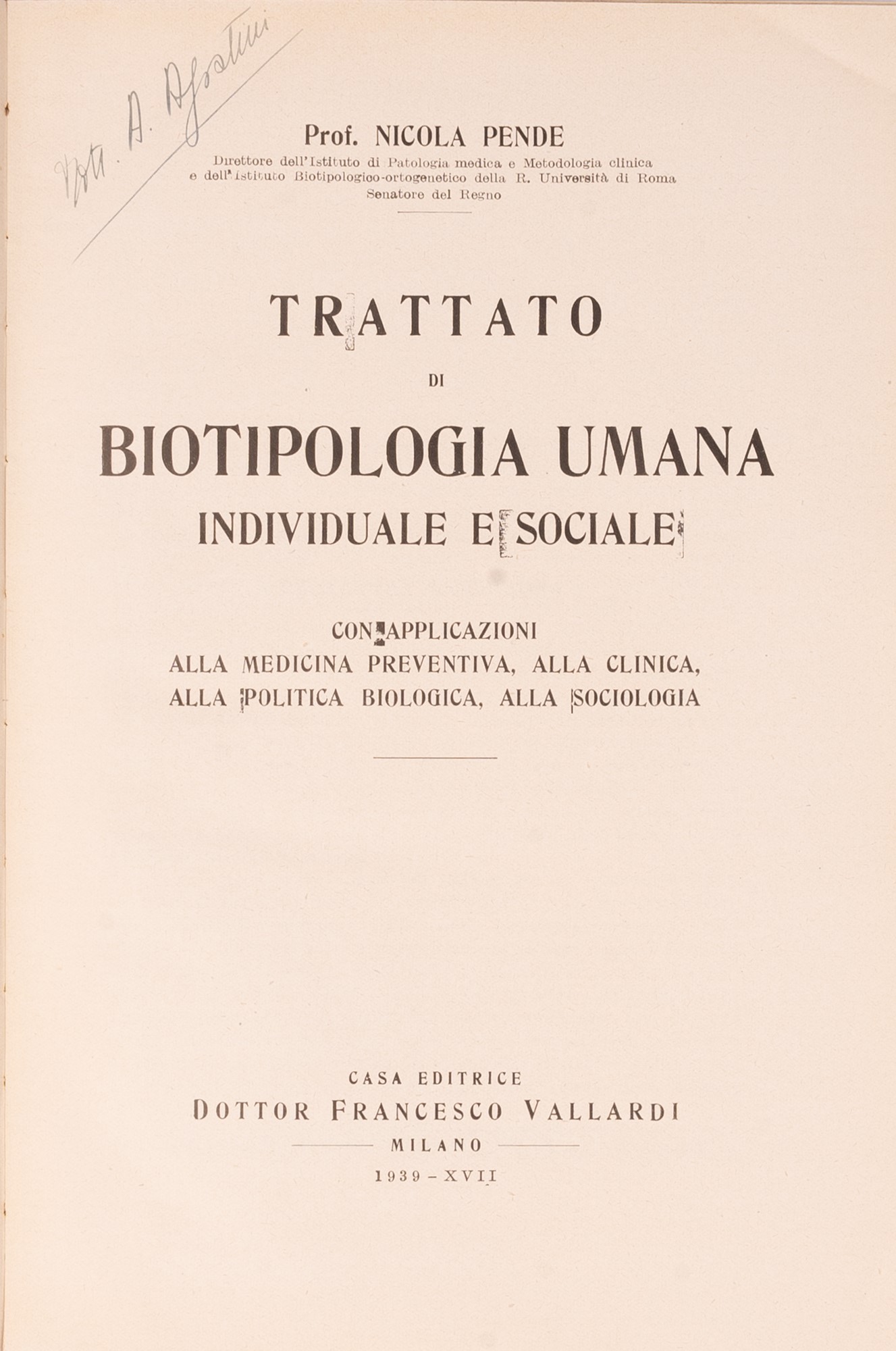 c) Nicola Pende. Trattato di Biotipologia Umana. Casa Editrice Vallardi. Milano. edizione telata;