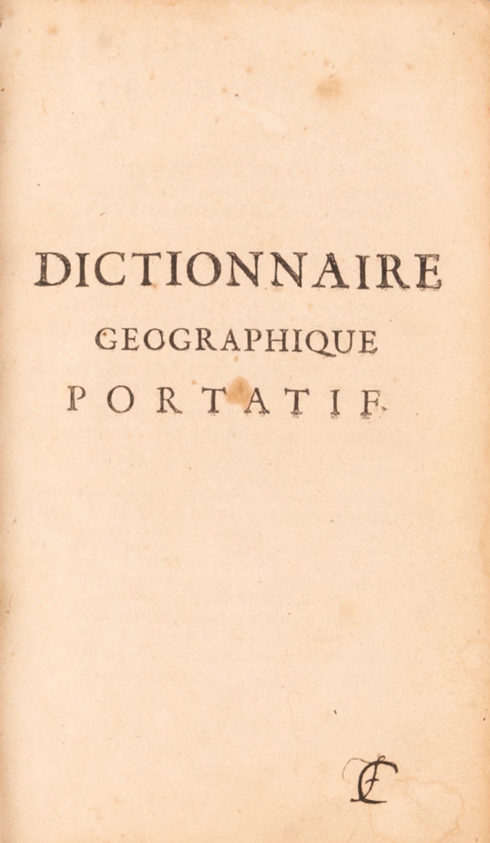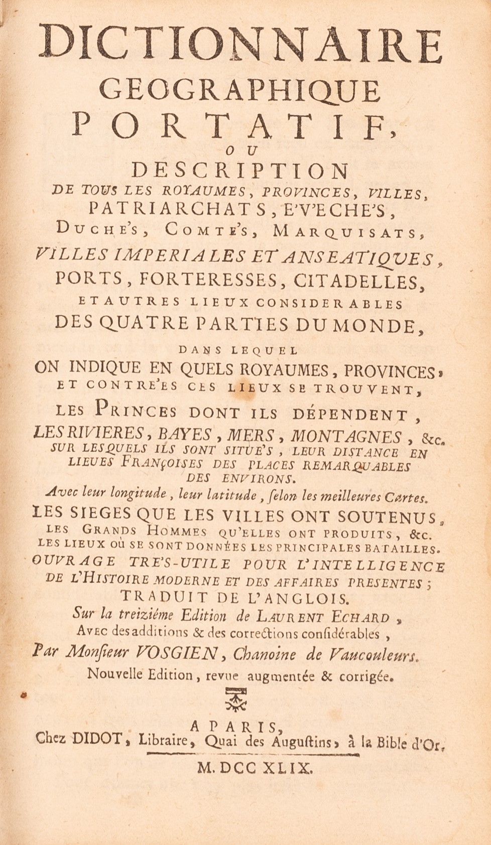 Dictionnaire géographique portatif, ou, Description de tous les royaumes, provinces, villes, patriarchats, evéchés, duchés, comtés, marguisats, villes impériales et anséatiques, ports, forteresses, citadelles, et autres lieux considerables des quatre parties du monde (...) Paris, chez Didot, 1749 1 volume in piena pelle con nervi, fregi in oro, titolo in testatina rossa, segni di usura sui piatti. qualche lieve macchia di foxing all'interno.