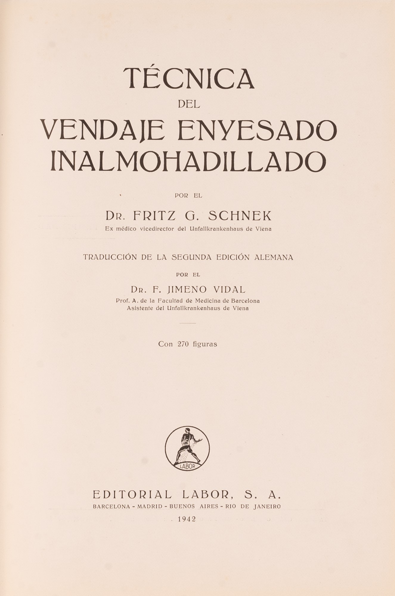 TÉCNICA DEL VENDAJE ENYESADO INALMOHADILLADO. G. Schnek Fritz. Editore T. Gràf. Barcelona, 1942