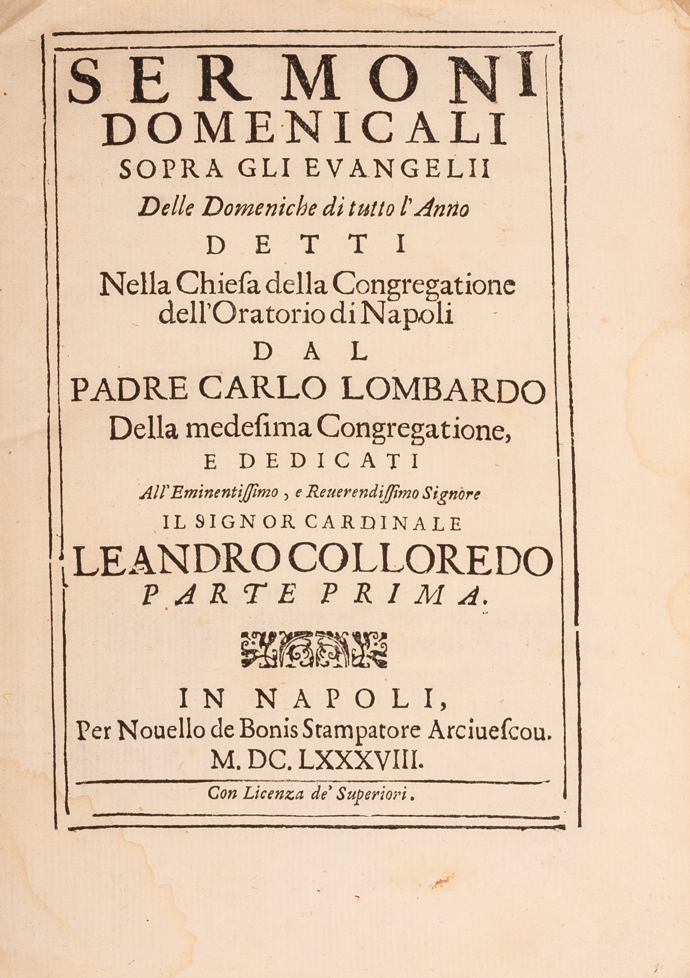 Sermoni Domenicali sopra gli evangeli domeniche di tutto l'anno detti nella chiesa della Congregazione dell'Oratorio dal Padre Carlo Lombardo della medesima Congregazione e dedicati all'Eminentissimo e Reverendissimo  Signore Il Signor Cardinal Leandro Colloredo