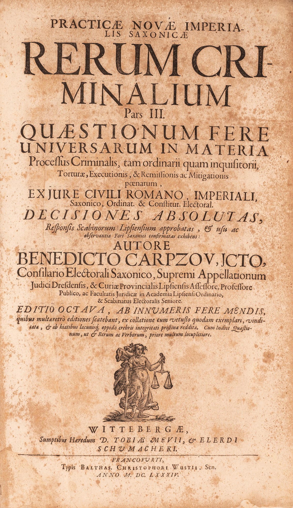 PRACTICAE NOVAE IMPERIALIS SAXONICAE RERUM CRIMINALIUM PARS III. Quaestionum fere universarum in materia processus Criminalis, tam ordinarii, quam inquisitorii, Torturae, Executionis, & Remissionis ac Mitigationis poenarum, EX JURE CIVILI ROMANO, IMPERIALI, Saxonico, Ordinat. Constitut. Electoral. DECISIONES ABSOLUTAS, RESPONSIS SCAbinorum Lipsensium approbatas, [et] usu ac observantia Fori Saxonici confirmatas, exhibens. Wittembergae, sumptibus Heredes Tobiae Mevii.
