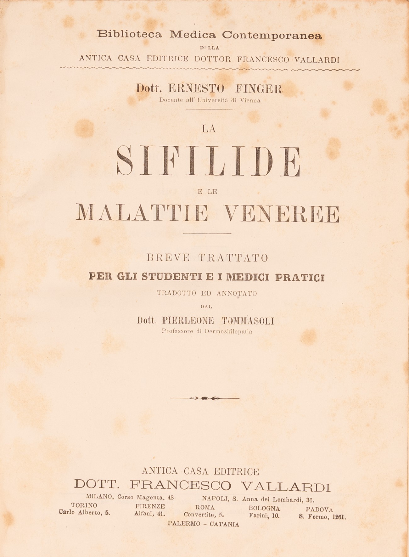 e) Dott. Ernesto Finger. La Sifilide e le malattie veneree. Breve trattato per gli studenti e i medici pratici, tradotto ed annotato dal Dott. Pierleone Tommasoli professore di dermosifilopatia, Vallardi;
