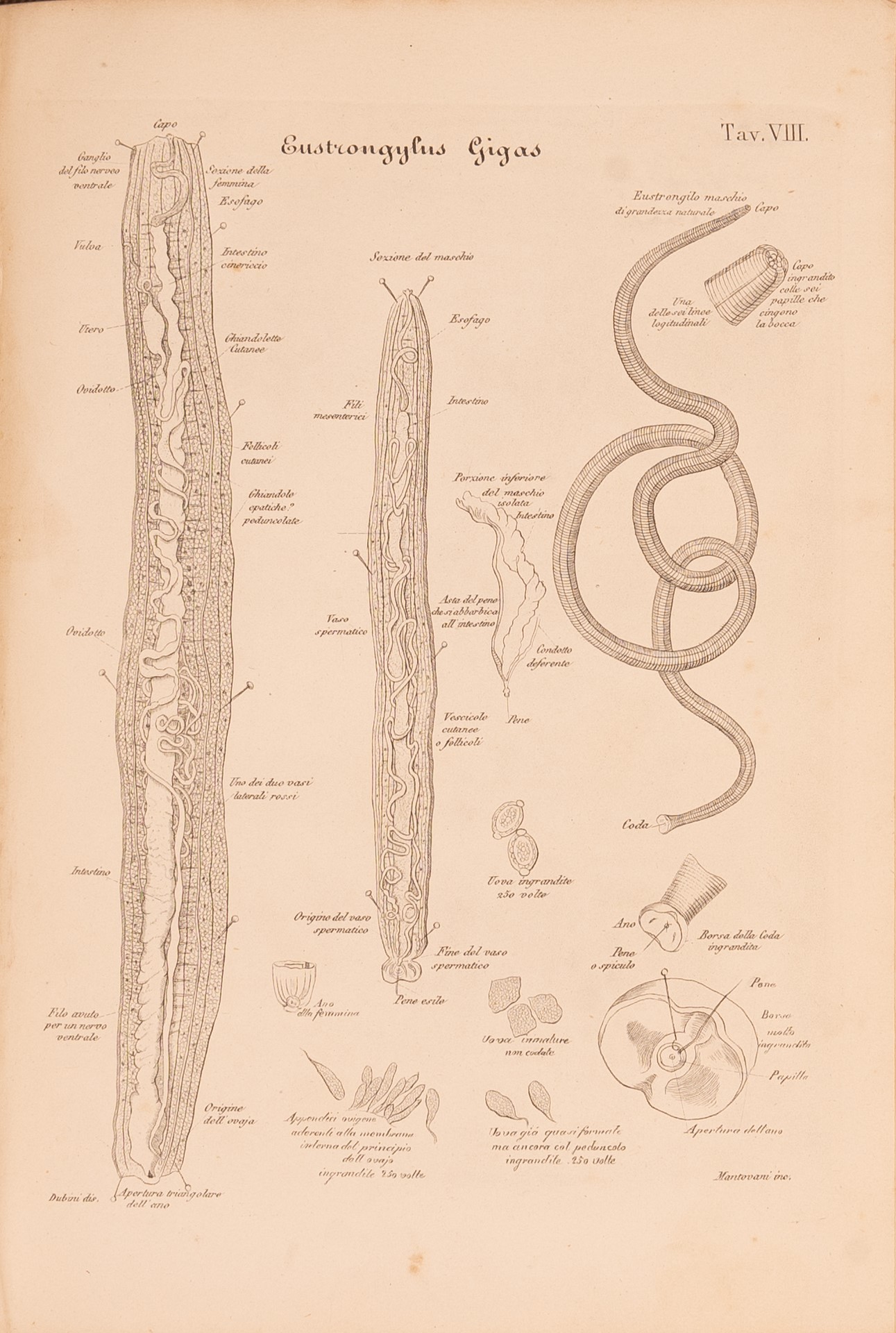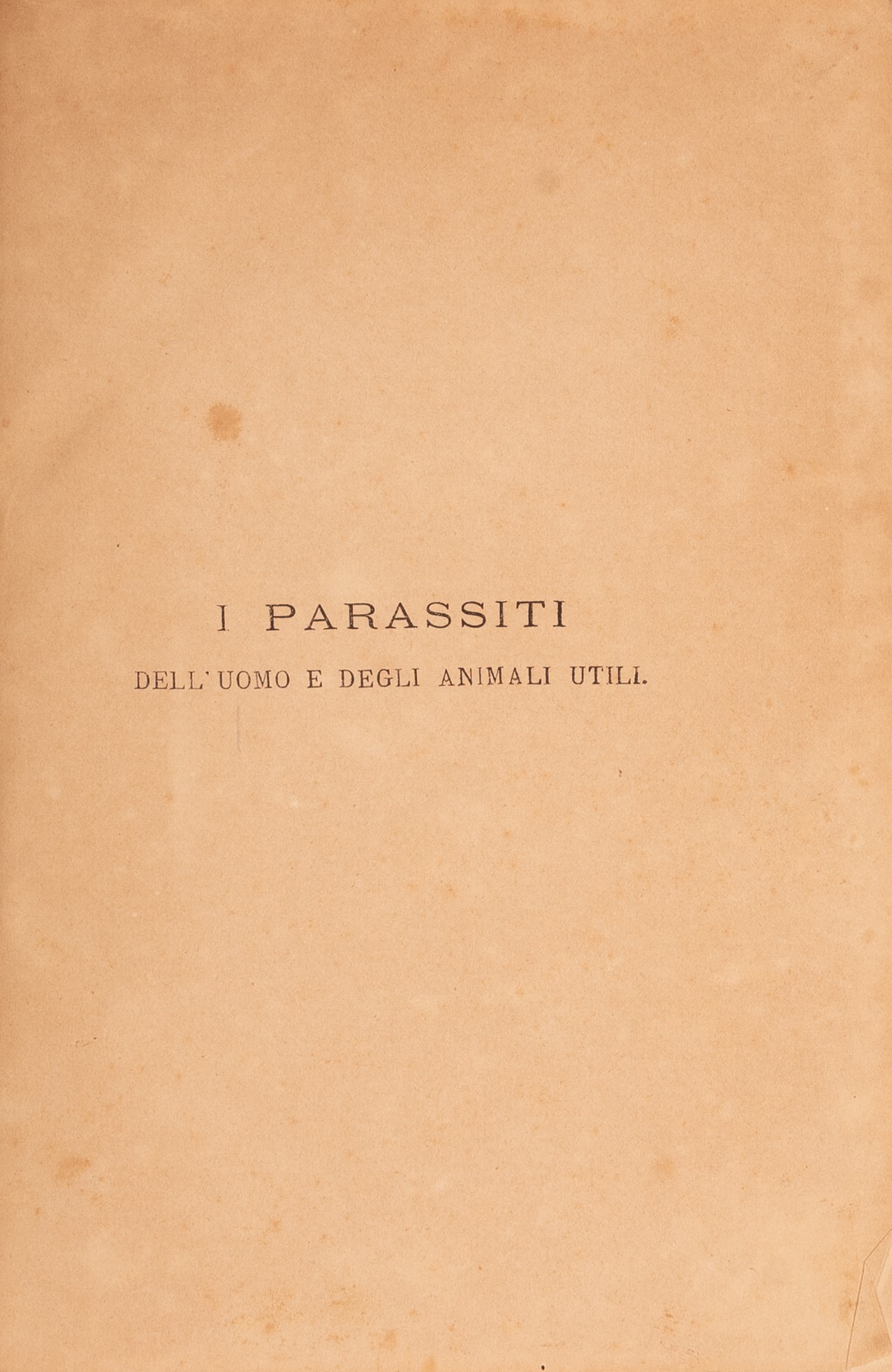 f) Perroncito Edoardo. I parassiti dell'uomo e degli animali utili. Milano. 1882. in ottavo, rilegato in pelle d'epoca, ppg 506 con 233 fgg. e XVI Tvv. Manca il frontespizio e per metà l'ultima pagina di indice alfabetico;