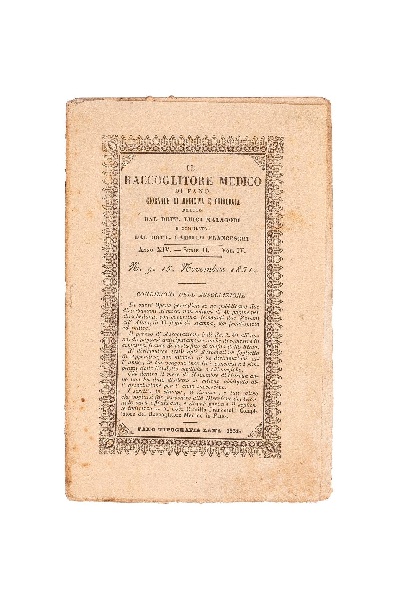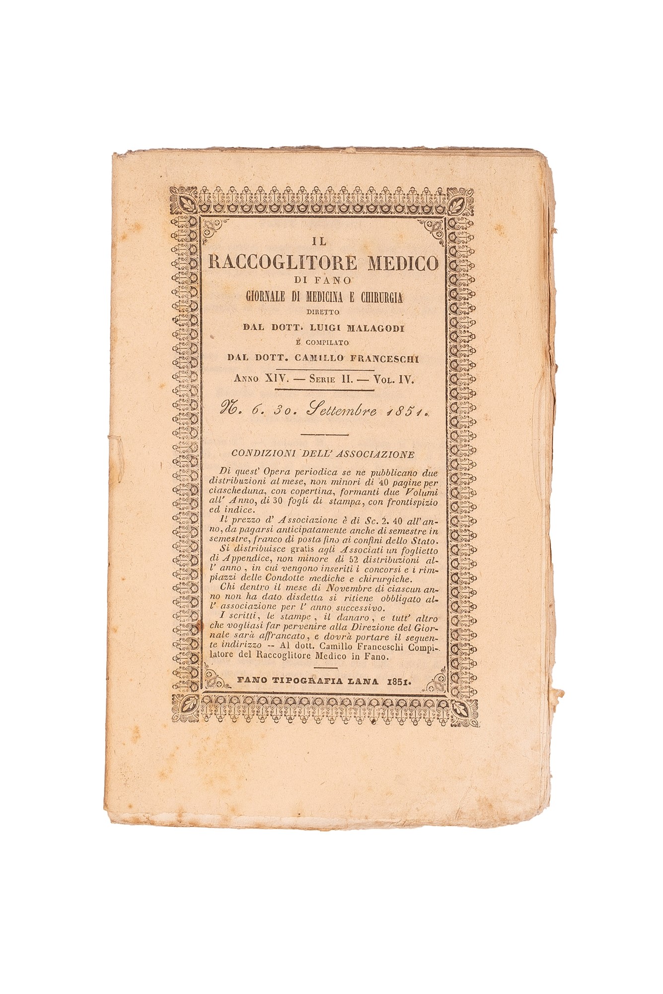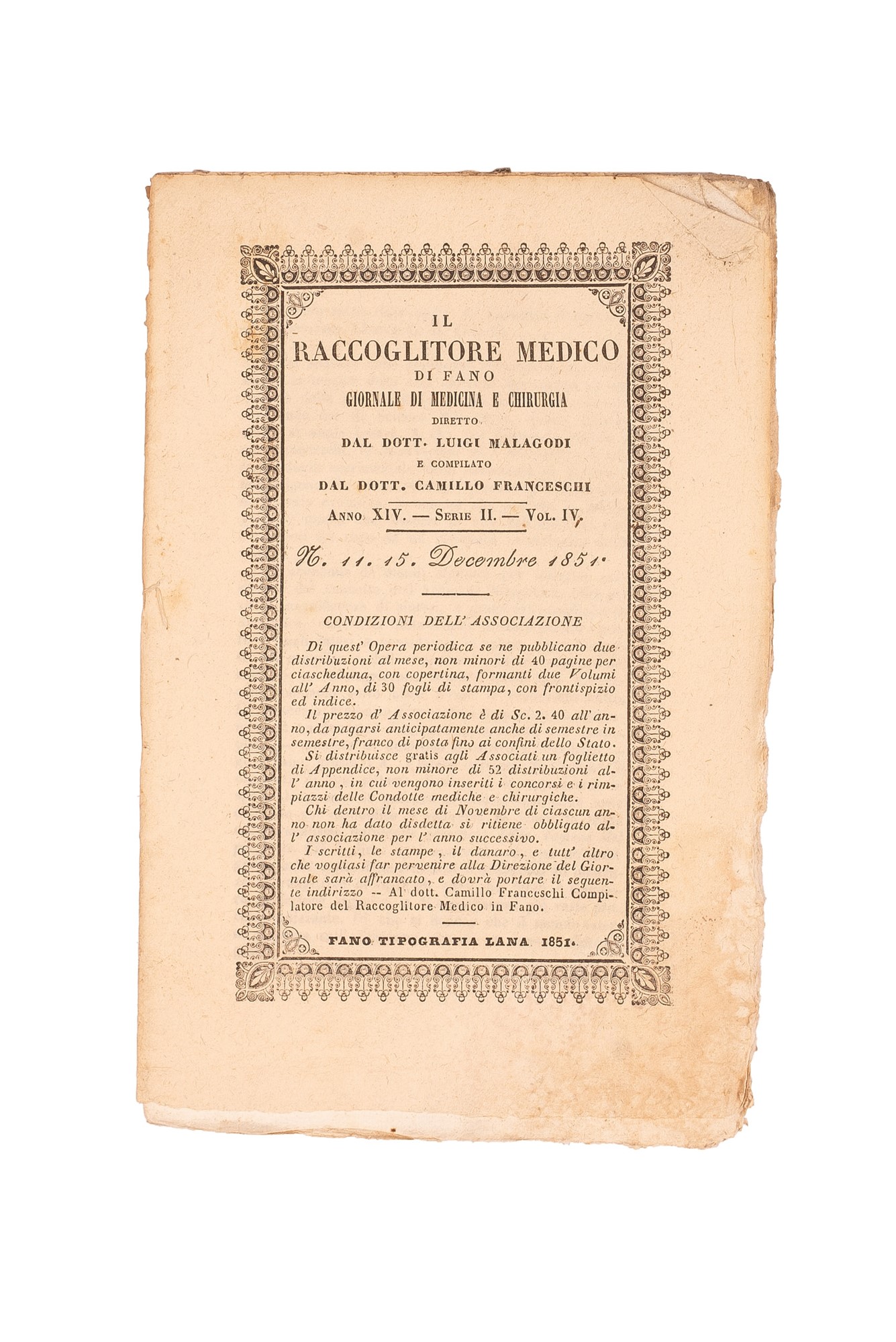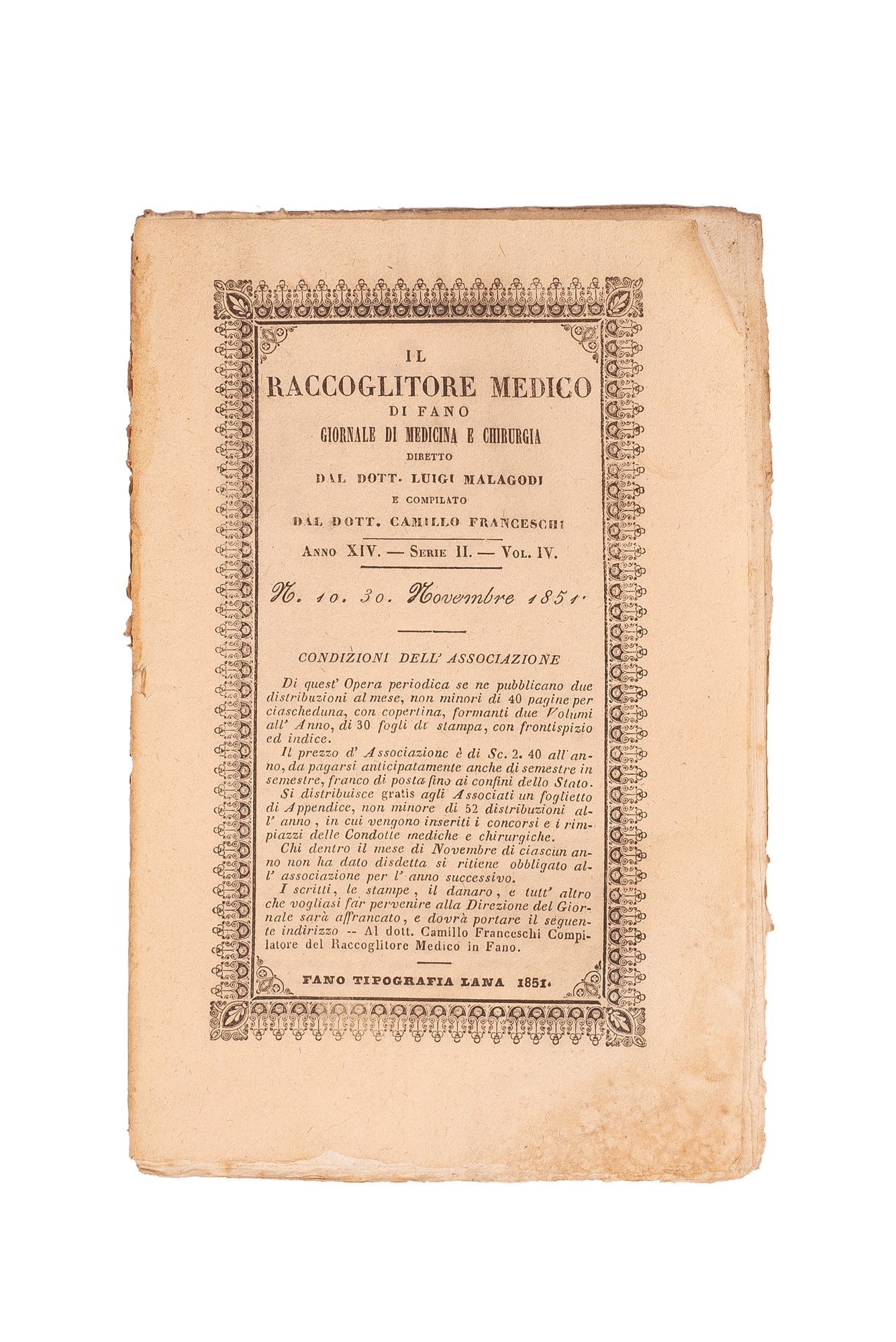h) Il Raccoglitore Medico di Fano. Giornale di Medicina e Chirurgia diretto dal Dott. Luigi Mallagodi, Anno XIV, Serie II, 12 volumetti con copertina cartonata, legati assieme da uno spago.