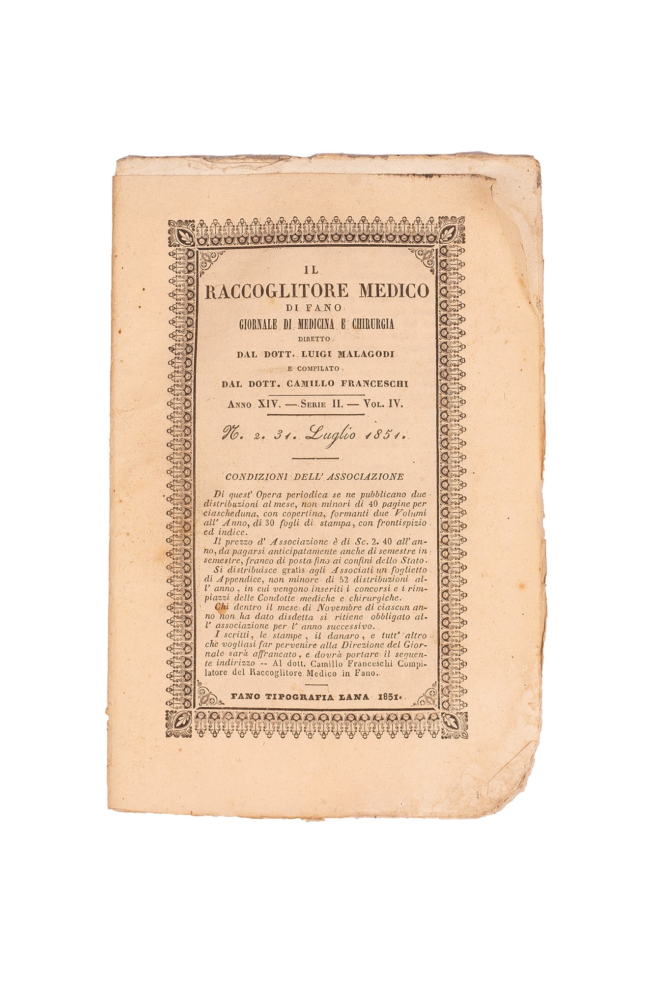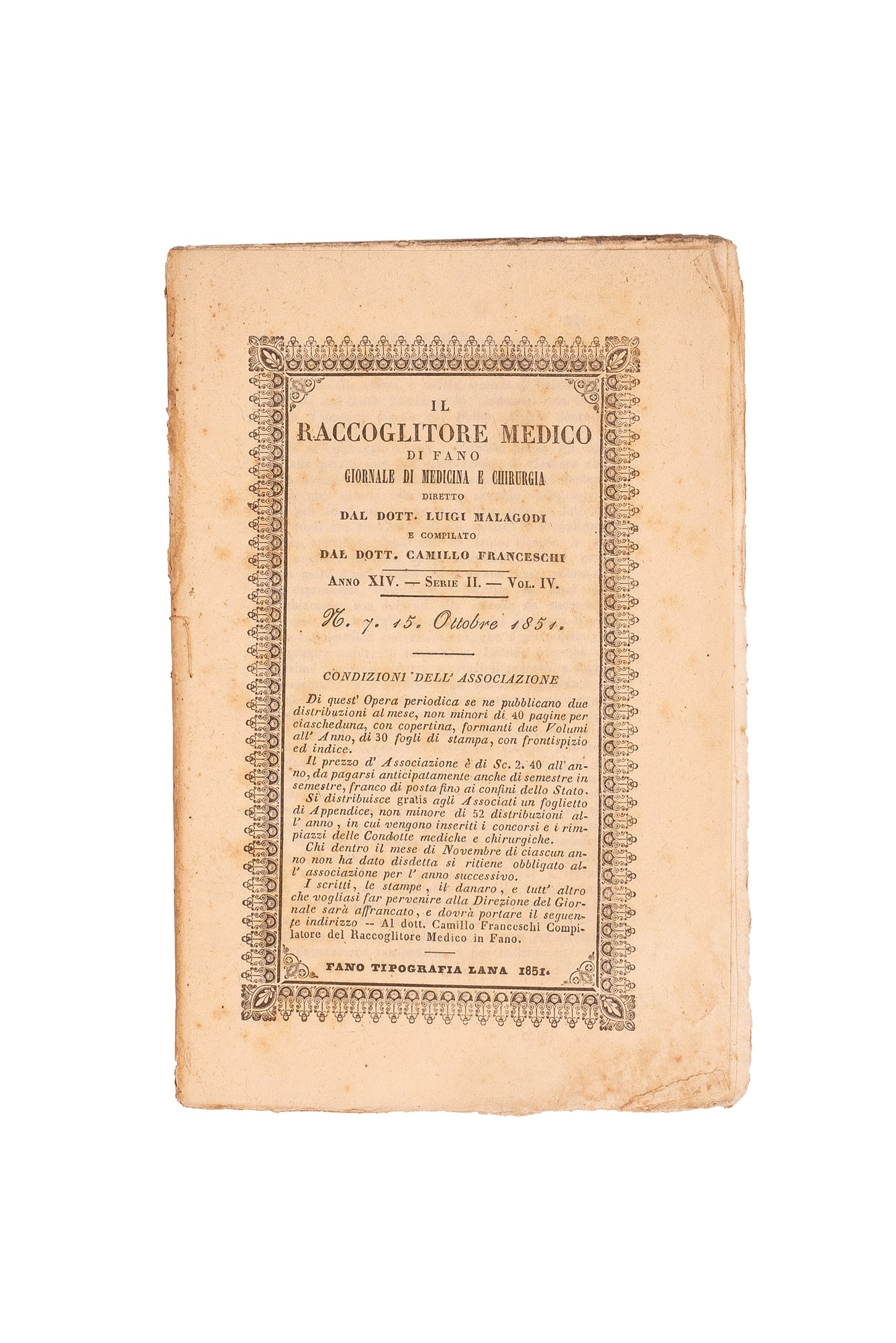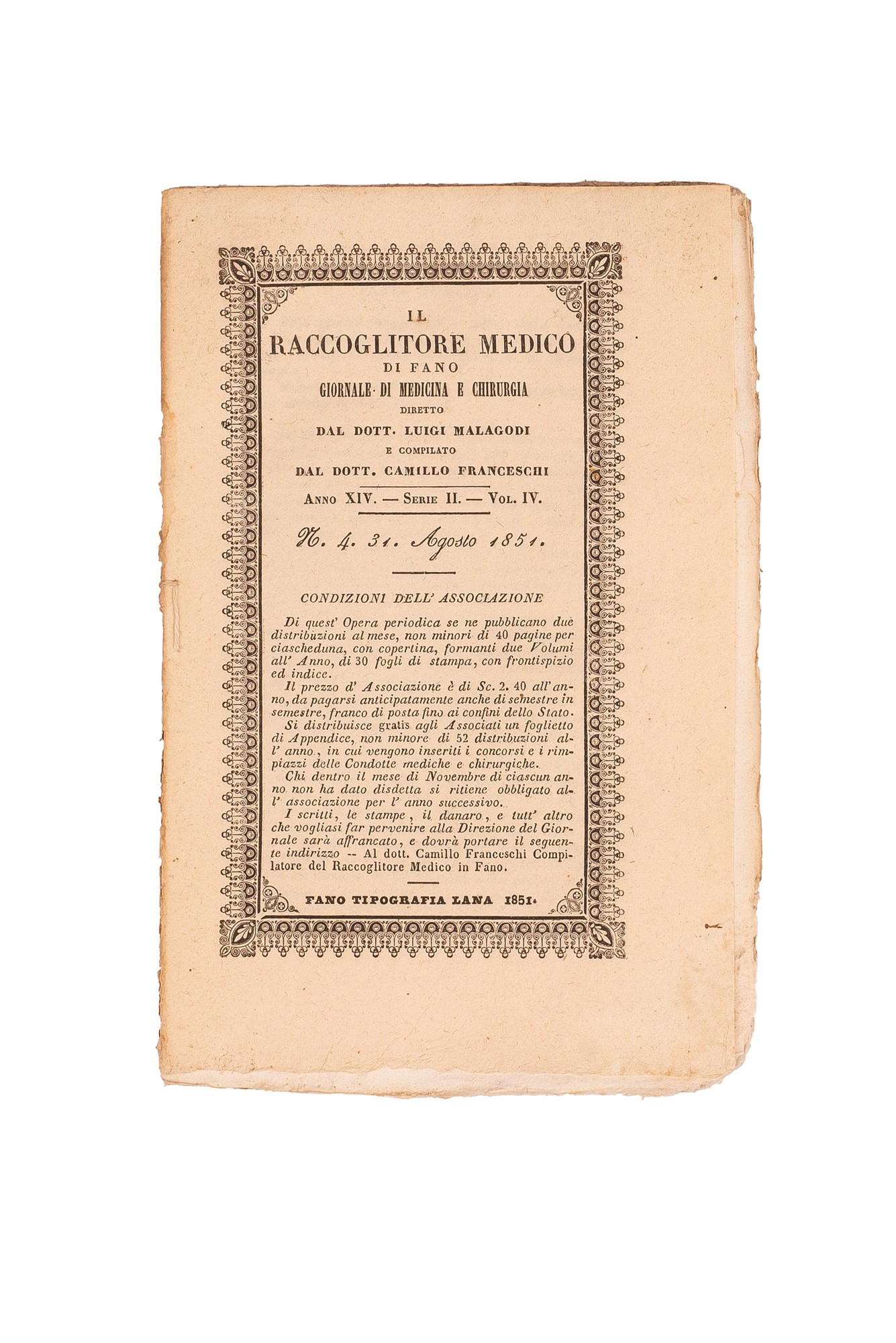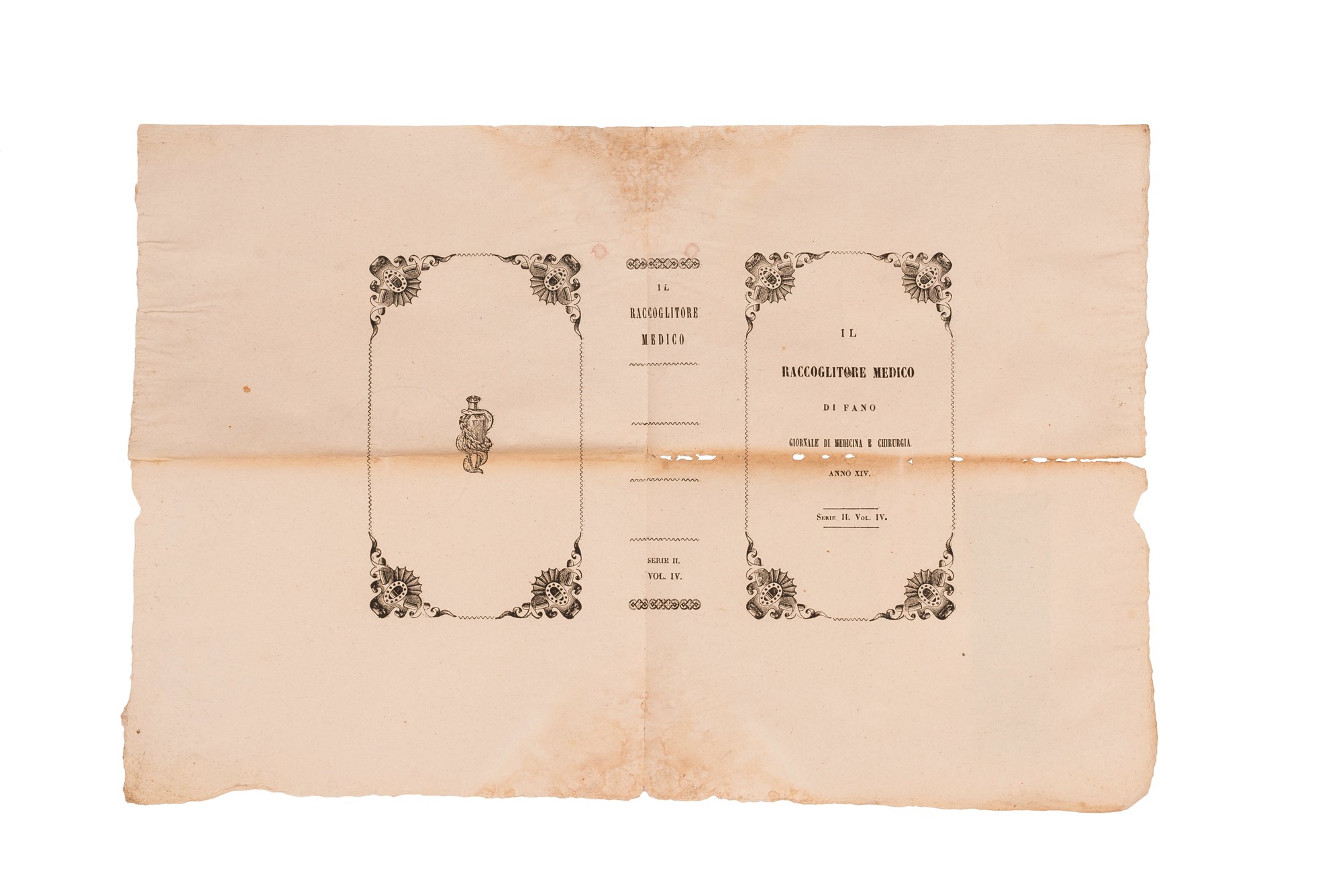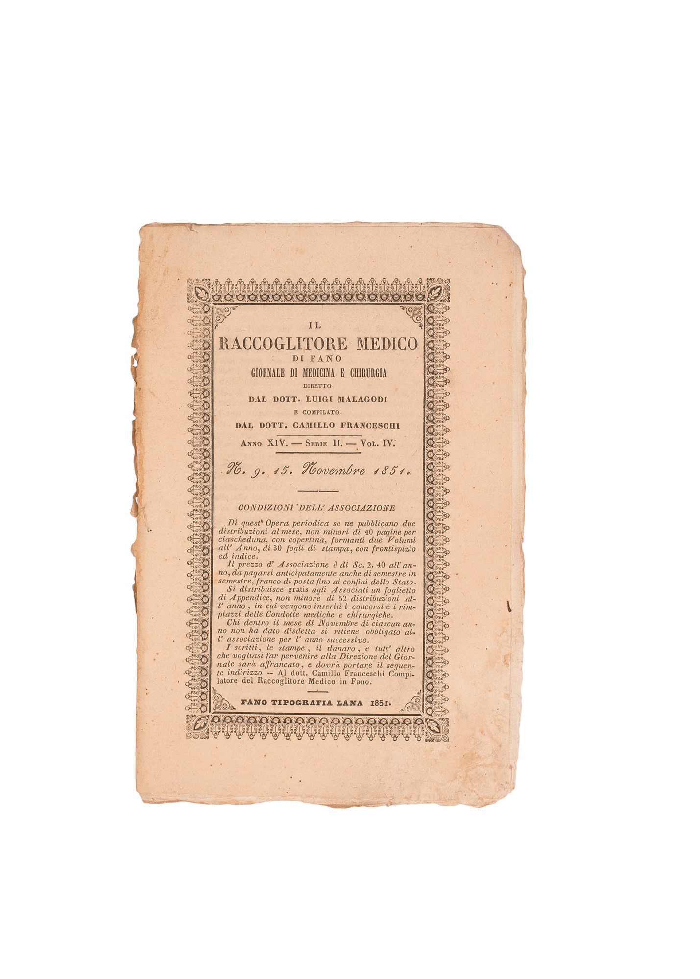 h) Il Raccoglitore Medico di Fano. Giornale di Medicina e Chirurgia diretto dal Dott. Luigi Mallagodi, Anno XIV, Serie II, 12 volumetti con copertina cartonata, legati assieme da uno spago.