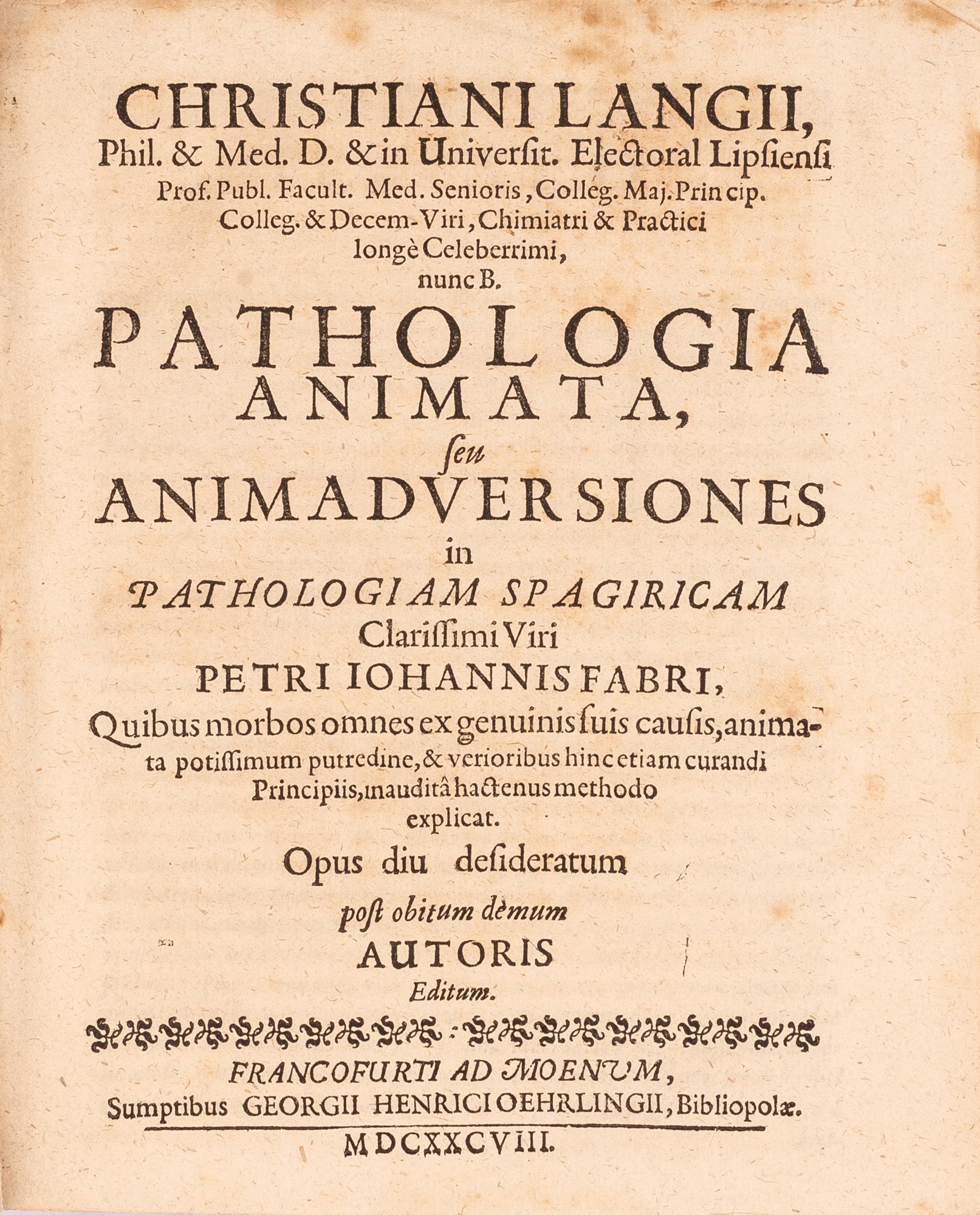 Christiani Langii Patalogia Animata Francofurti ad moenum 1688