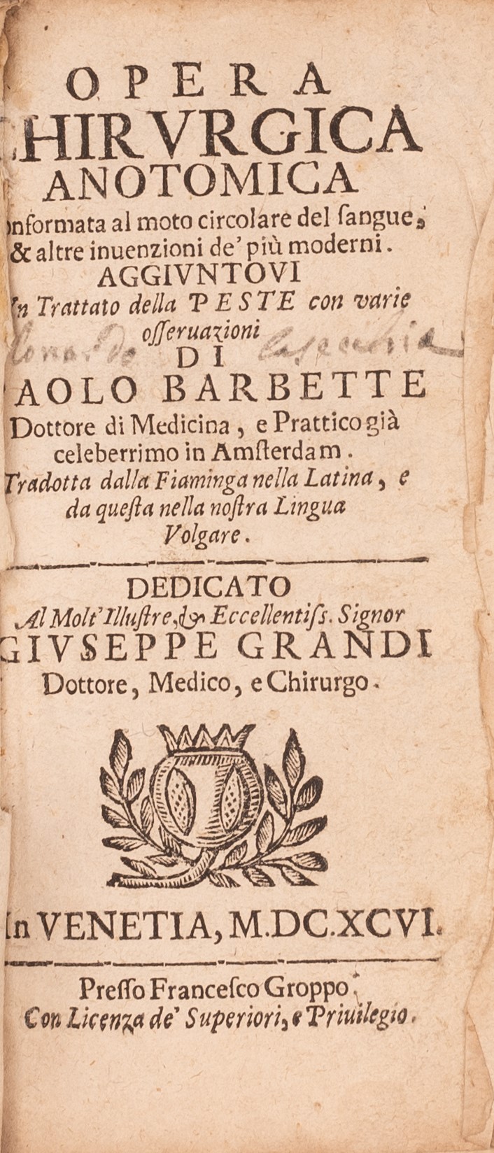 Opera chirurgica anotomica conformata al moto circolare del sangue, & altre inuenzioni de' più moderni. Aggiuntoui vn trattato della peste con varie osseruazioni di Paolo Barbette ... tradotta dalla fiamminga nella latina, e da questa nella nostra lingua volgare. ..