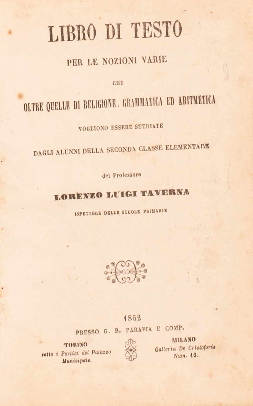 Libro di testo per le nozioni varie che oltre quelle di religione, grammatica ed aritmetica vogliono essere studiate dagli alunni della seconda classe elementare del professore Lorenzo Luigi Taverna ispettore delle scuole primarie.