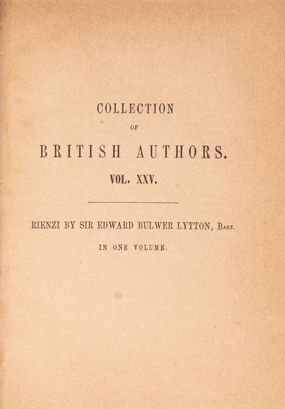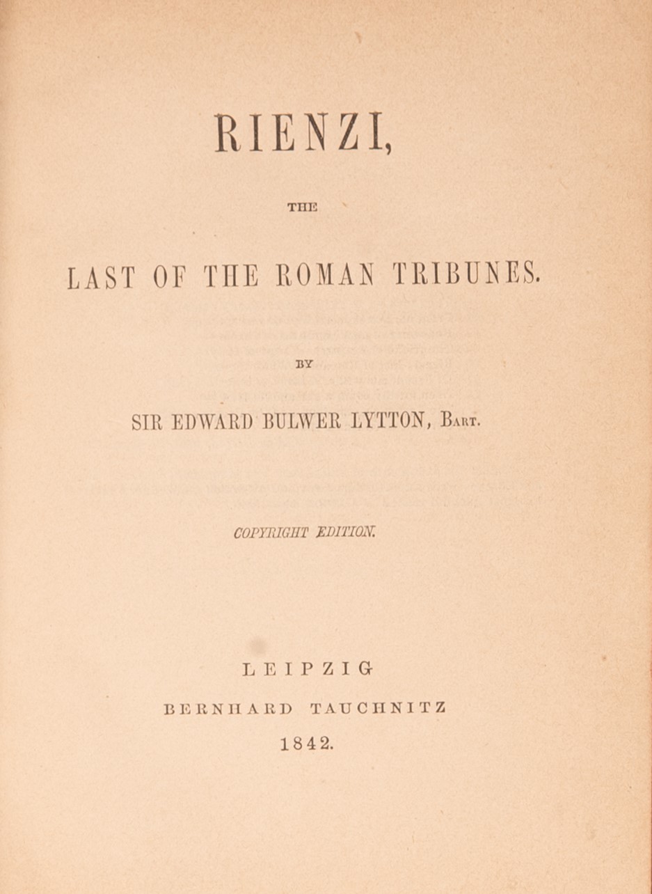 a) Rienzi. The Last of the Romans Tribunes , by Sir Edward Bulwer Lytton, Bart. Leipzing Bernhard Tauchnitz. 1842;
