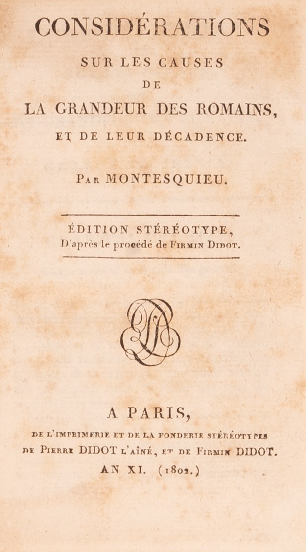 b) Considerations sur le causes de le grandeur des romains, et de leur dècadence par Montesquieu. A Paris, 1802;
