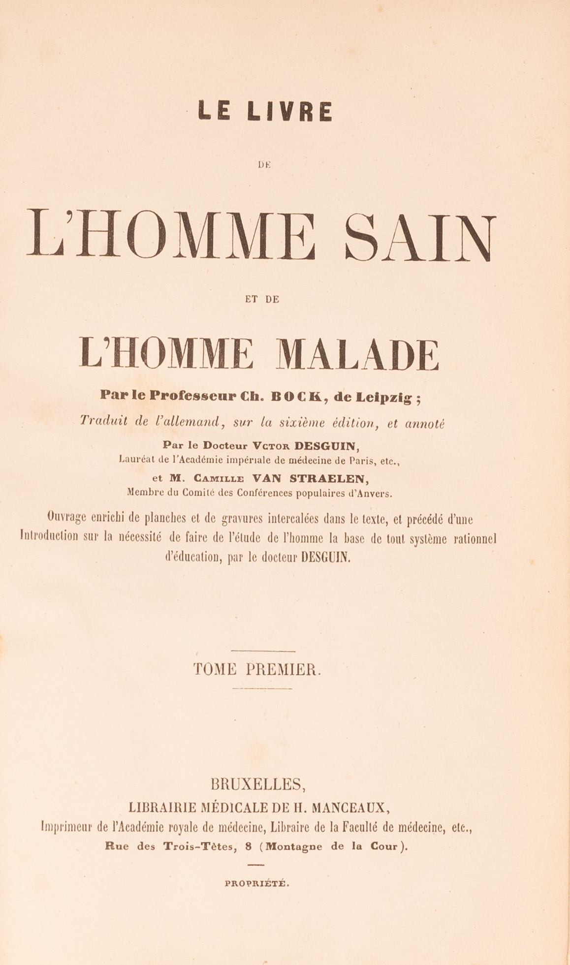 b) Le Livre de l'Homme Sainet de l'Homme Malade, par le Professeur Ch. BOCK, de Leipzig. Tome Premier , Bruxelles, Libraire Medicale de H. Manceaux;