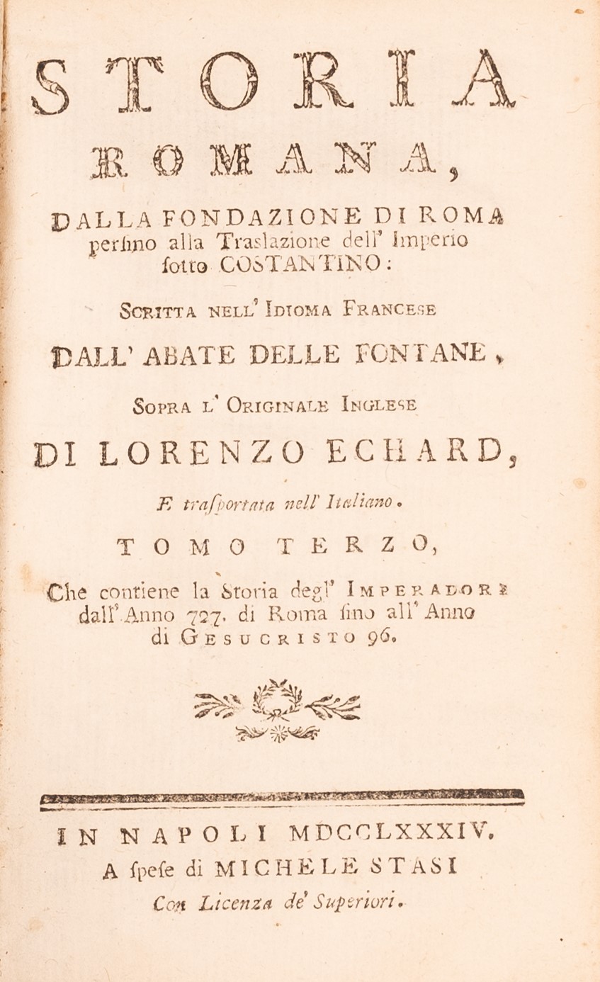 - Storia Romana dalla fondazione di Roma perfinio alla traslazione dell'imperio sotto Costantino scritta nell'idioma francese dall'Abate Delle Fontane, sopra l'originale inglese di Lorenzo Echard