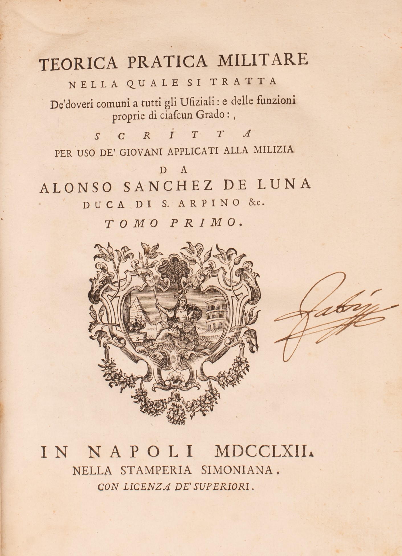 Teorica pratica militare nella quale si tratta de' doveri comuni a tutti gli ufficiali, e delle funzioni proprie di ciascun grado. Scritta per uso de' giovani applicati alla Milizia da Alonzo Sanchez De Luna Duca di Arpino (TomoI)
