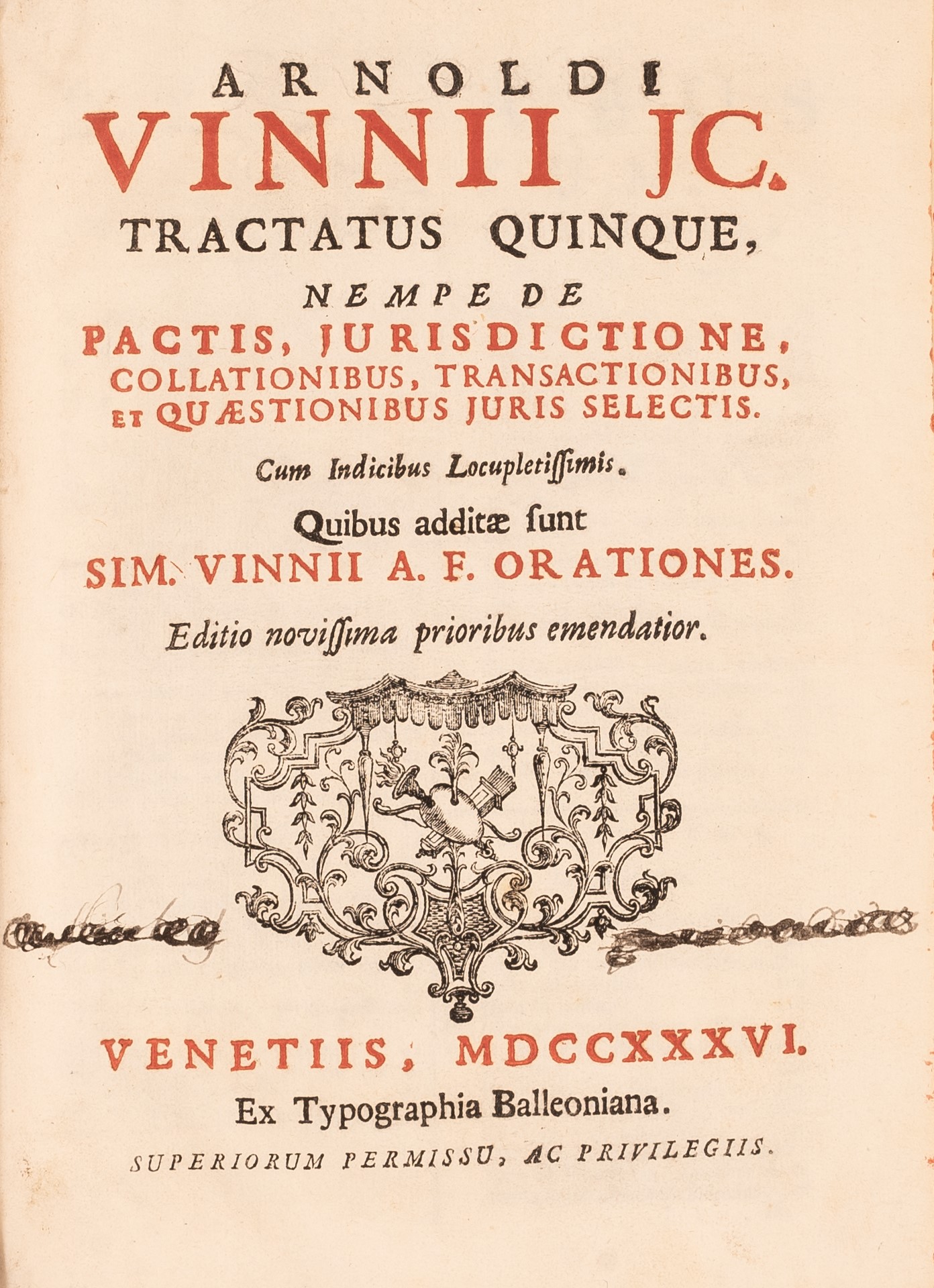 - Arnoldi Vinnii jc. Jurisprudentiae contractae, sive partitionum juris civilis libri quattuor, variis observationibus Ad usum forensem accomodatis illustrati