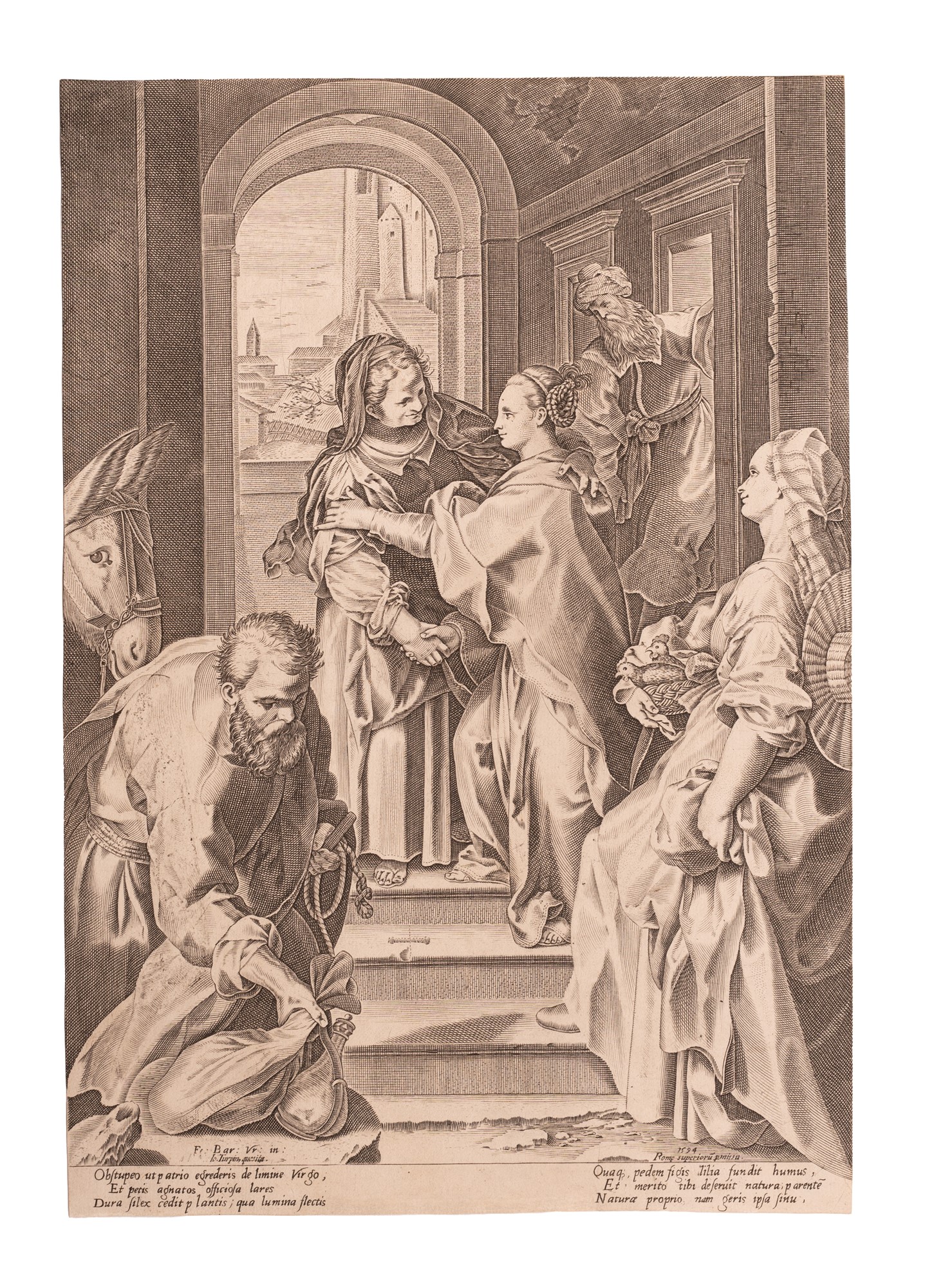 ( - ) - La Visitazione, dopo Federico Barocci, con al centro la Vergine che incontra santa Elisabetta su una scalinata, san Giuseppe in piedi a sinistra che depone su una roccia un sacco e una zucca, ea destra una donna che porta galline in una cesta intrecciata; oltre, Zaccaria vide varcare una porta, a destra.