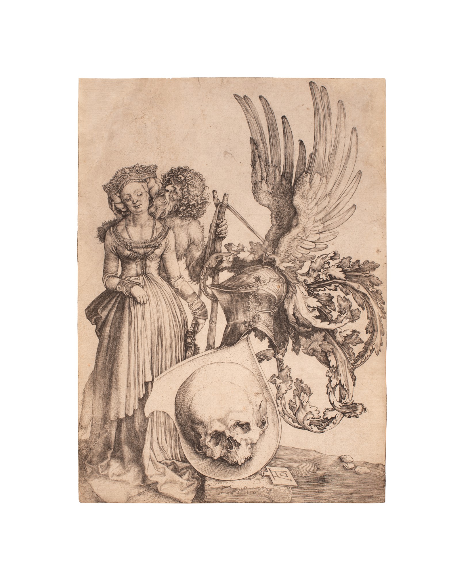 Descrizione: Questa magistrale incisione - precedutadall’analoga ma meno ambiziosa Stemma con il gallo (Meder 97) - rappresenta unoscudo con un teschio enorme, sormontato da un elmo alato, sorretto da unselvaggio e da una fanciulla in abito festoso immersi in amorosa conversazione.Da un punto di vista iconografico questa composizione si potrebbe descriverecome una versione araldica del tema “Amore e Morte” trattato nel disegno dettoI piaceri mondani, e nell’incisione nota come La passeggiata (Meder 83); da unpunto di vista tecnico si potrebbe dire che ha ancora molto della delicatezzaminiaturistica propria della Nemesi (Meder 72) e del Sant’Eustachio (Meder 60),ma ritrova insieme la fermezza e la precisione di tratto che distingue le sueprime incisioni. La sua sensibilità per la materia non mostra di indebolirsi.L’avorio levigato ma friabile del teschio, il contrasto tra l’acciaio politodell’elmo e il metallo più opaco dello scudo, la carne delicata della fanciullae le membra irsute del selvaggio, la differenza tra le piume e le penne, ilridondante fogliame della copertura - tutto ciò è acutamente osservato e resocon penetrazione. Pure, l’andamento calligrafico dei contorni è cosi volutamenteaccentuato e i tratteggi e i piccoli punti che costituiscono il modellatointerno così rigidamente schematizzati e così largamente spaziati, che ognielemento, dalle curve ampie ai trattini apparentemente casuali, adempie a unafunzione sia ornamentale che rappresentativa. Dürer stesso sembra essere statoconsapevole del carattere per certi aspetti definitivo delle incisioni del1503. Fatta eccezione per il caso isolato delle Quattro streghe (Meder 69)queste sono le sue prime stampe datate oltre che firmate. D’ora innanzi tuttele sue incisioni, salvo tre, saranno datate (mentre la datazione dellesilografle non divenne abituale in Dürer fino al 1509-1510). E veramente ogniulteriore sviluppo che si osservi nel suo stile incisorio, può essere definito neitermini del suo rapporto con lo stile del 1503. (E. PANOFSKY La vita e le operedi Albrecht Dürer Londra 1965 Milano 1967, pagg.110-111).