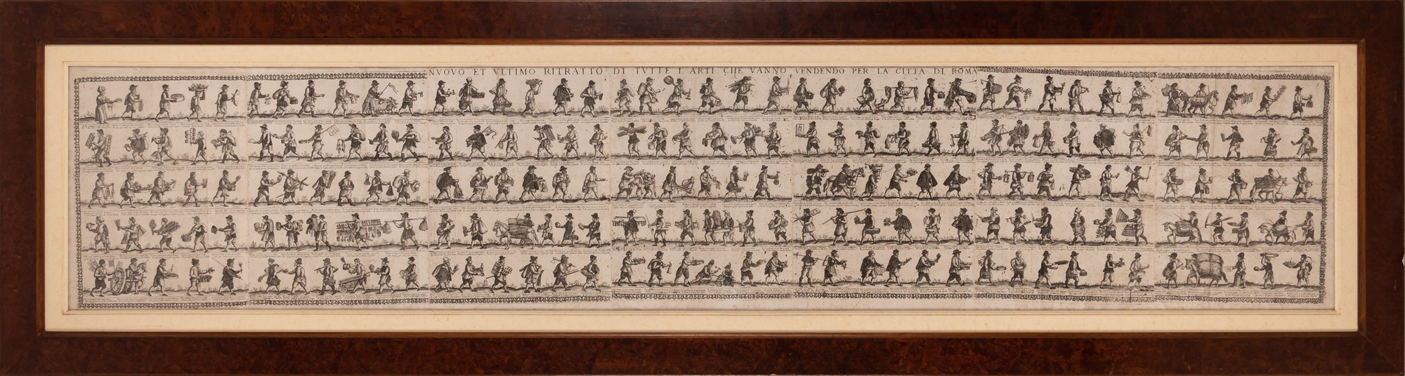 (Padova, 1634 - Bassano del Grappa , 1711) - Stampa in sette fogli numerati da 1 a 7, inscritto in basso a destra 'in Bassano per il Remondini', cornice moderna di legno e radica, sotto vetro; usure, piegature e ondulazioni, tracce di umidità e sporco, macchie, restauri cm 42x113; con cornice cm 63,5x235