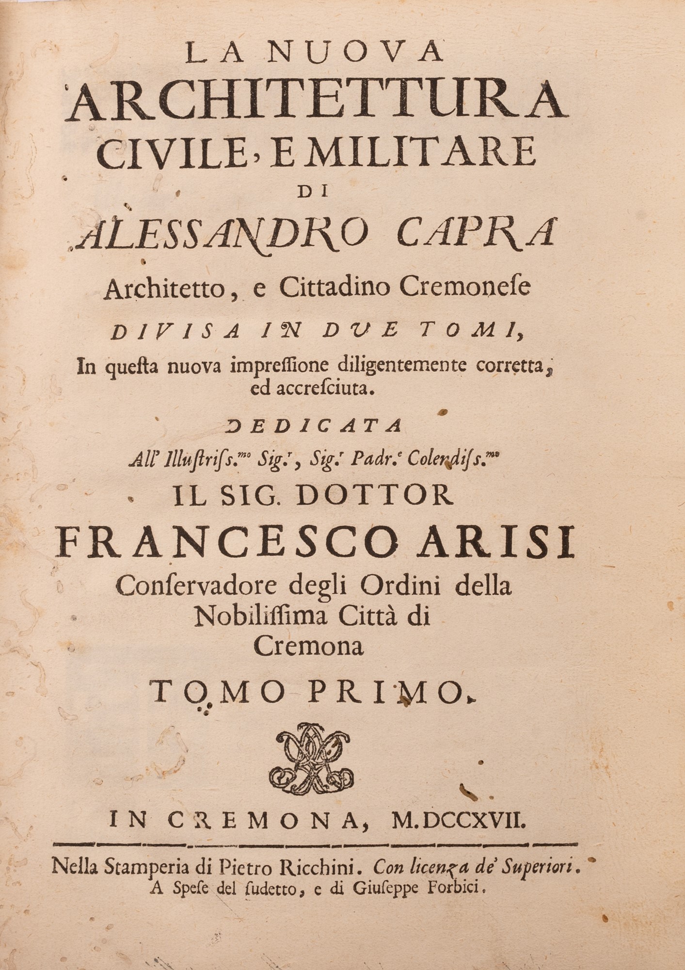 - TITOLO: La nuova architettura civile, e militare di Alessandro Capra architetto, e cittadino cremonese divisa in due tomi, in questa nuova impressione diligentemente corretta, ed accresciuta ... Tomo primo [-secondo]