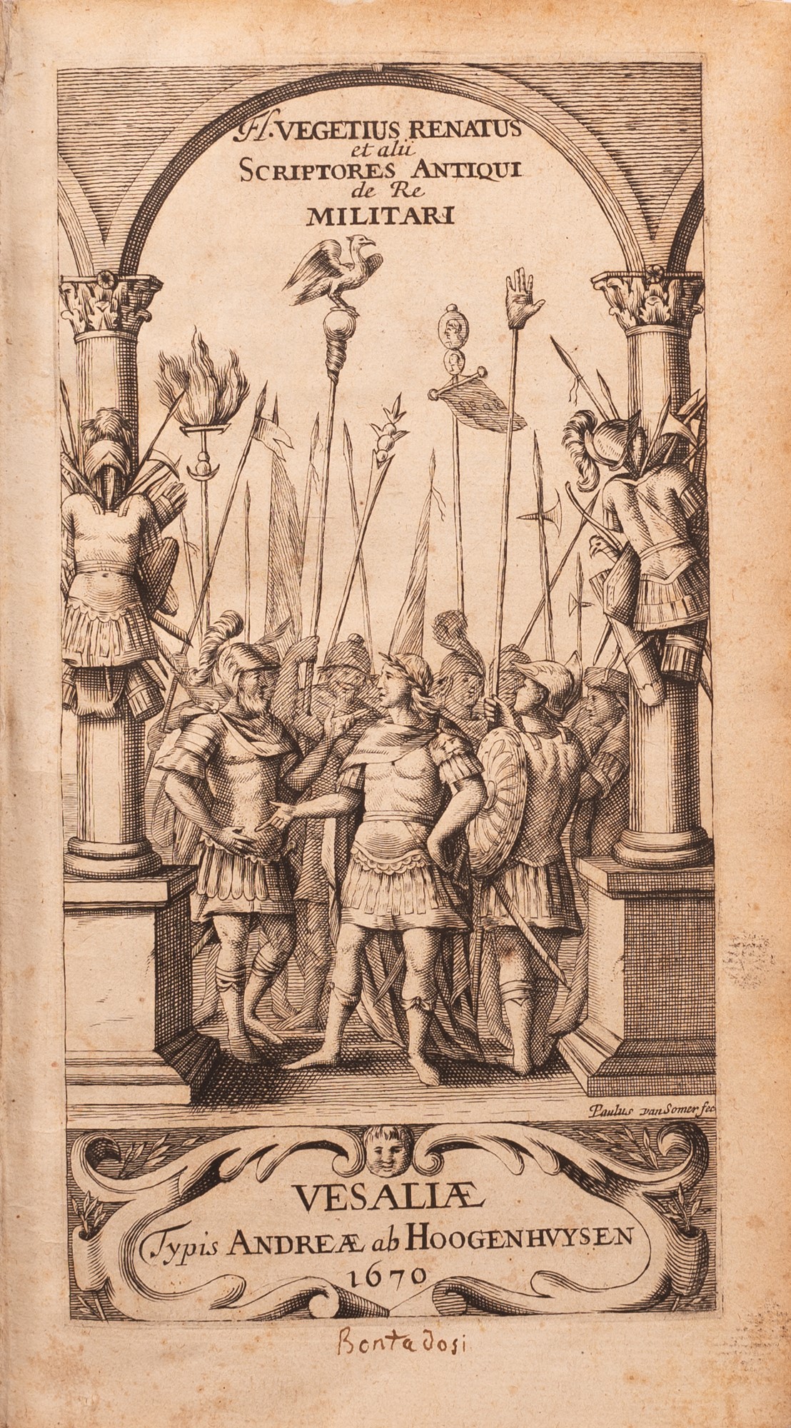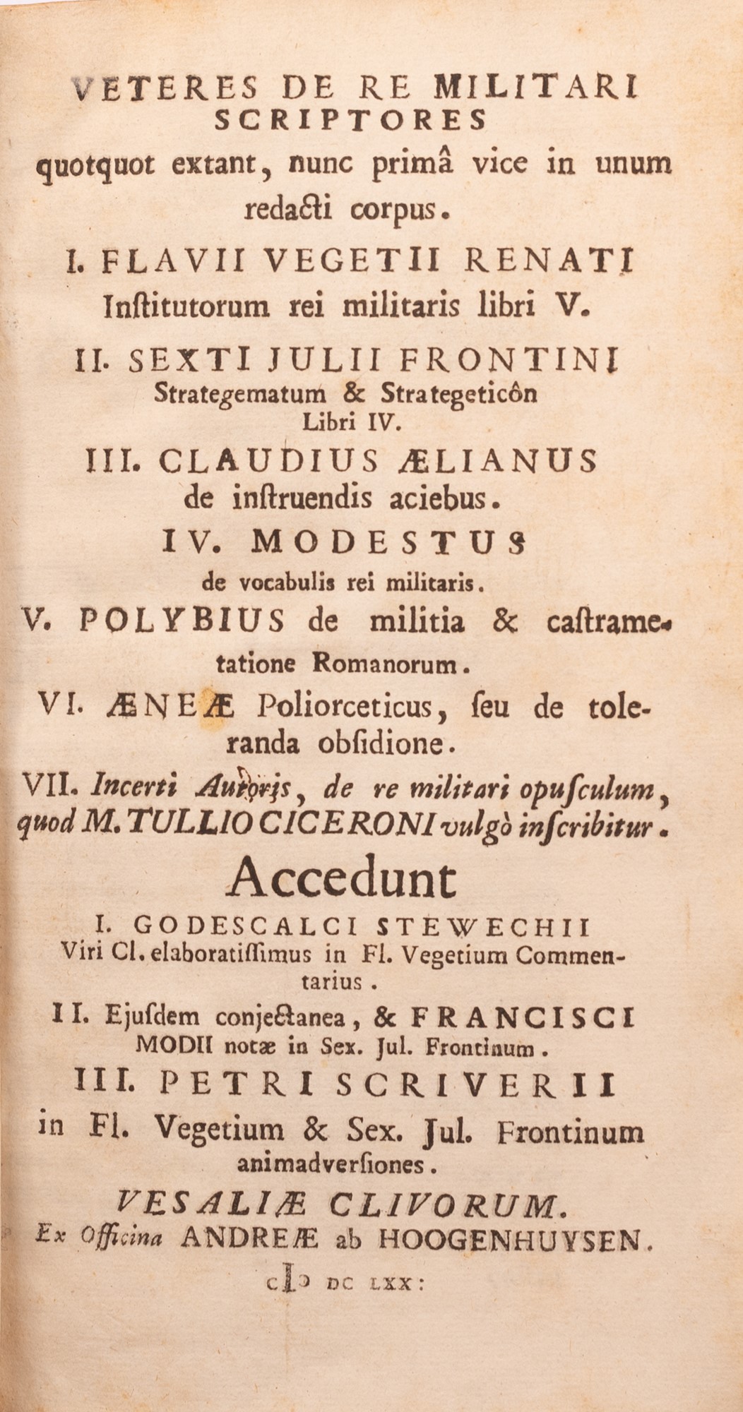 - TITOLO: Veteres de re militari scriptores quotquot extant, nunc primâ vice in unum redacti corpus. 1. Flavii Vegetii Renati institutorum rei militaris libri 5. 2. Sexti Julii Frontini strategematum & strategeticôn libri 4. 3. Claudius Aelianus de instruendis aciebus. 4. Modestus de vocabulis rei militaris. 5. Polybius de militia & castrametatione Romanorum. 6. Aeneae poliorceticus, seu de toleranda obsidione. 7. Incerti auctoris, de re militari opusculum, quod M. Tullio Ciceroni vulgò inscribitur. Accedunt 1. Godescalci Stewechii viri Cl. elaboratissimus in Fl. Vegetium commentarius. 2. Ejusdem conjectanea, Francisci Modii notae in Sex. Jul. Frontinum. 3. Petri Scriverii in Fl. Vegetium & Sex. Jul. Frontinum animadversiones