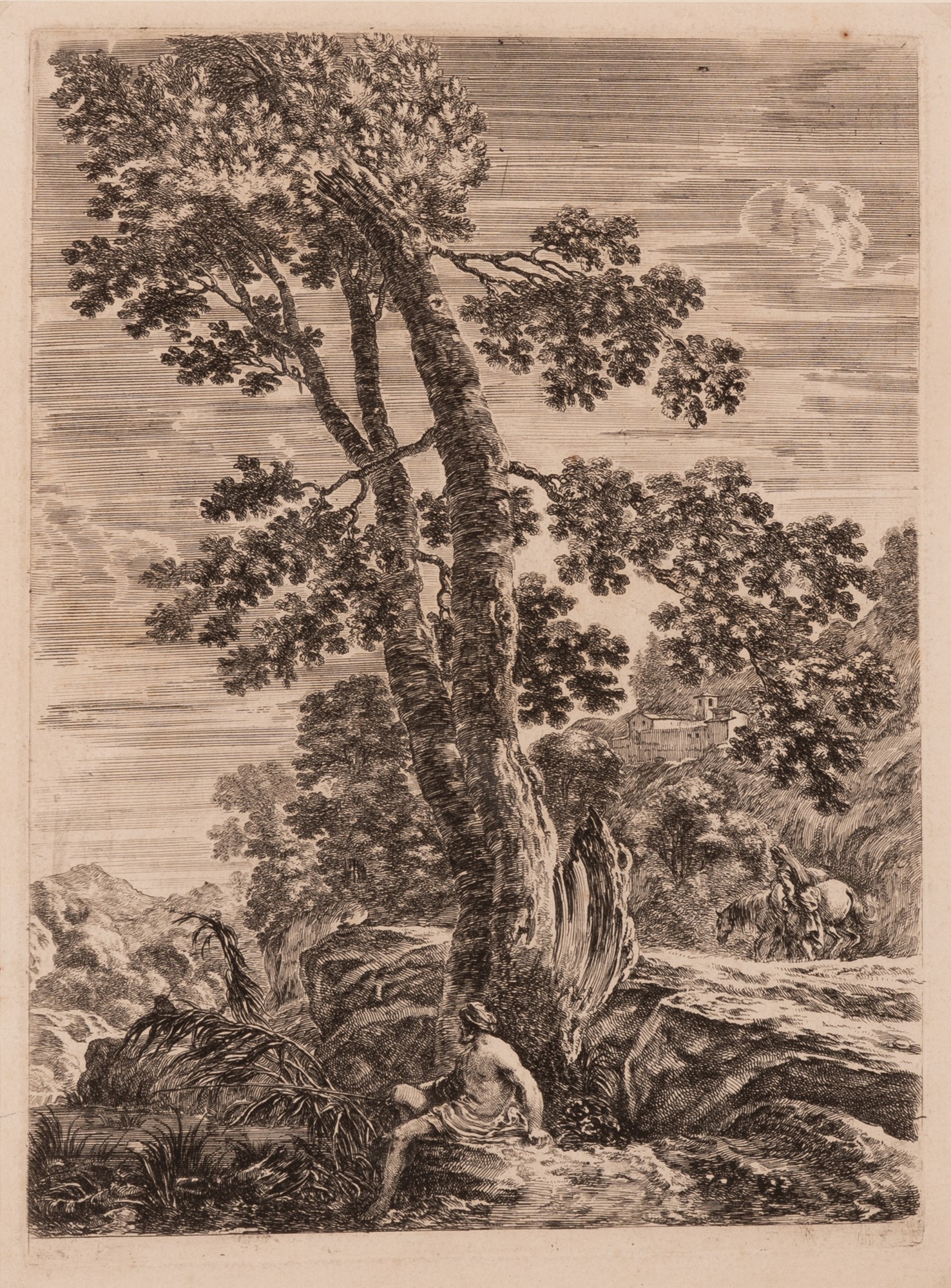 Grande paesaggio con pescatore sotto l'albero.