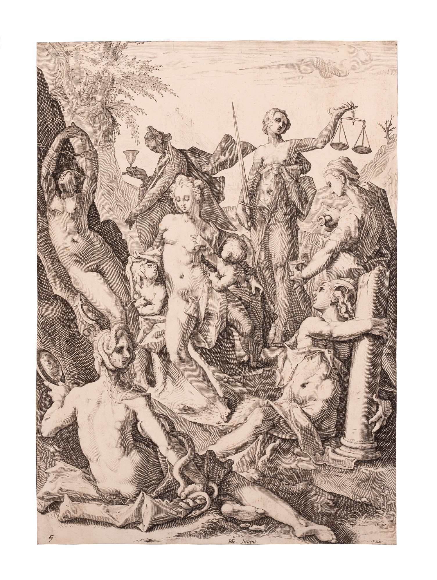 (Haarlem, 1571 - Haarlem, 1631) - Soggetto mitologico e allegorie, bella prova su cartavergellata, rifilata ai margini e manche il testo in basso. Al verso timbro dicollezione non in Lugt.