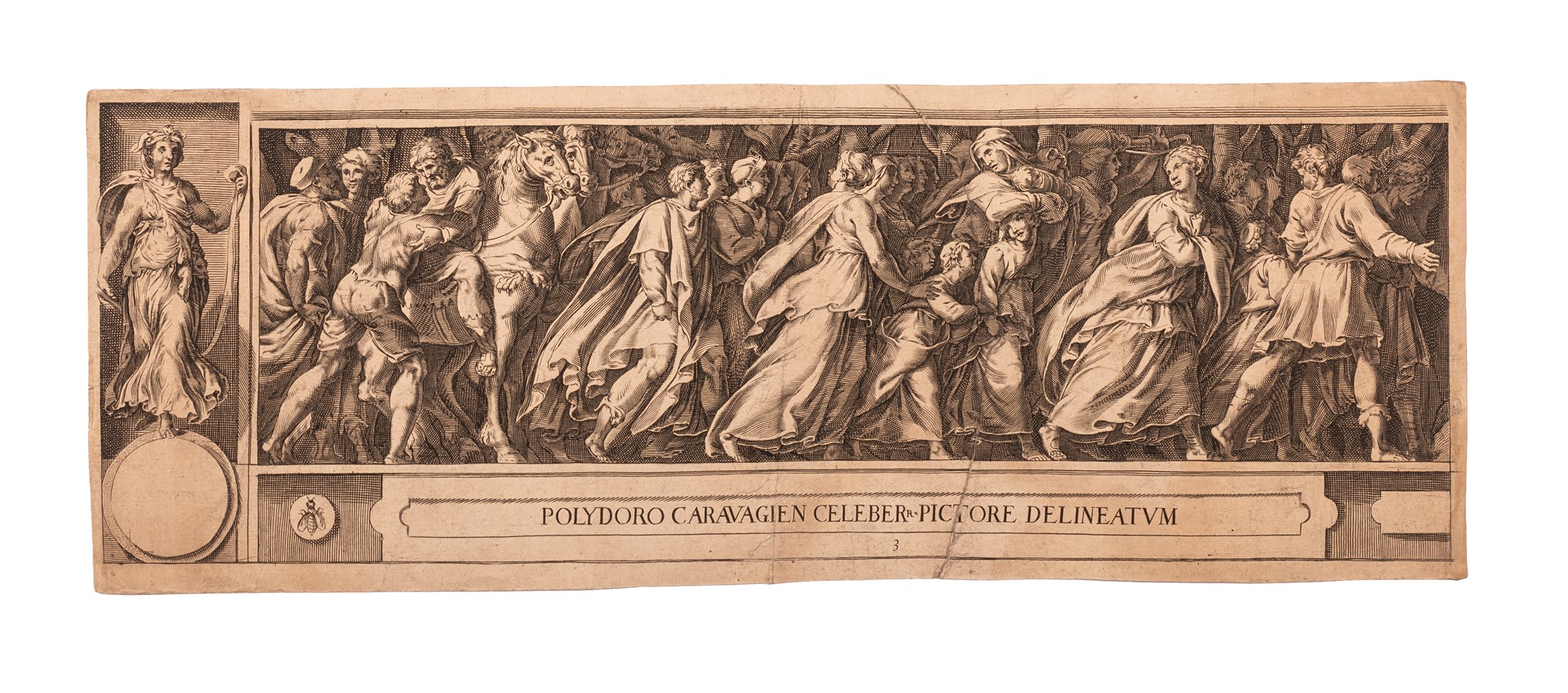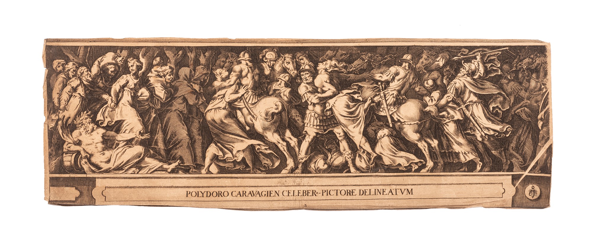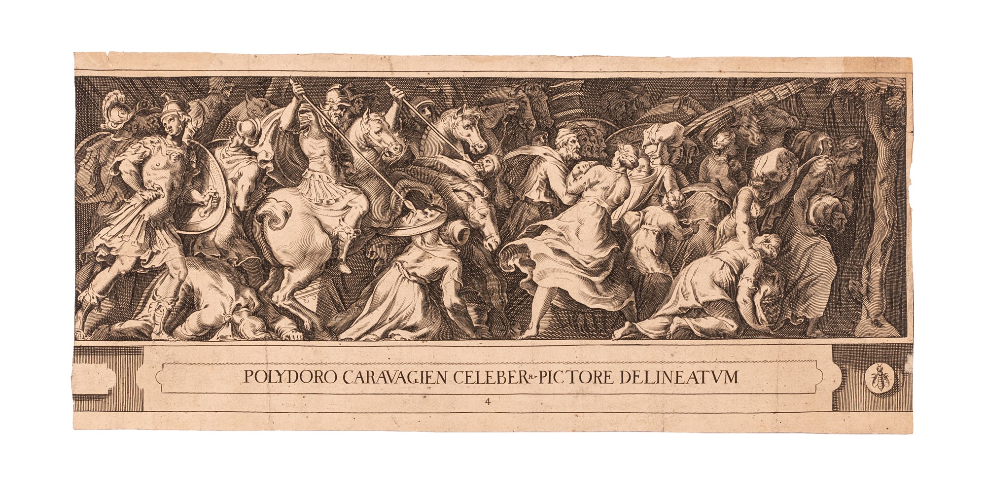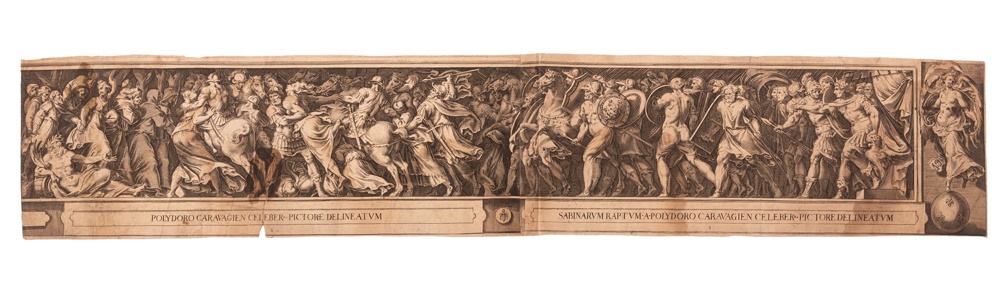 - Tratti dagli affreschi di Polidoro da Caravaggio sullafacciata di Palazzo Ricci a Roma, e un fregio di Palazzo Barberini, Iscrizione:"Sabinarum raptum a Polydoro Caravagien celeber picture delineatum/.