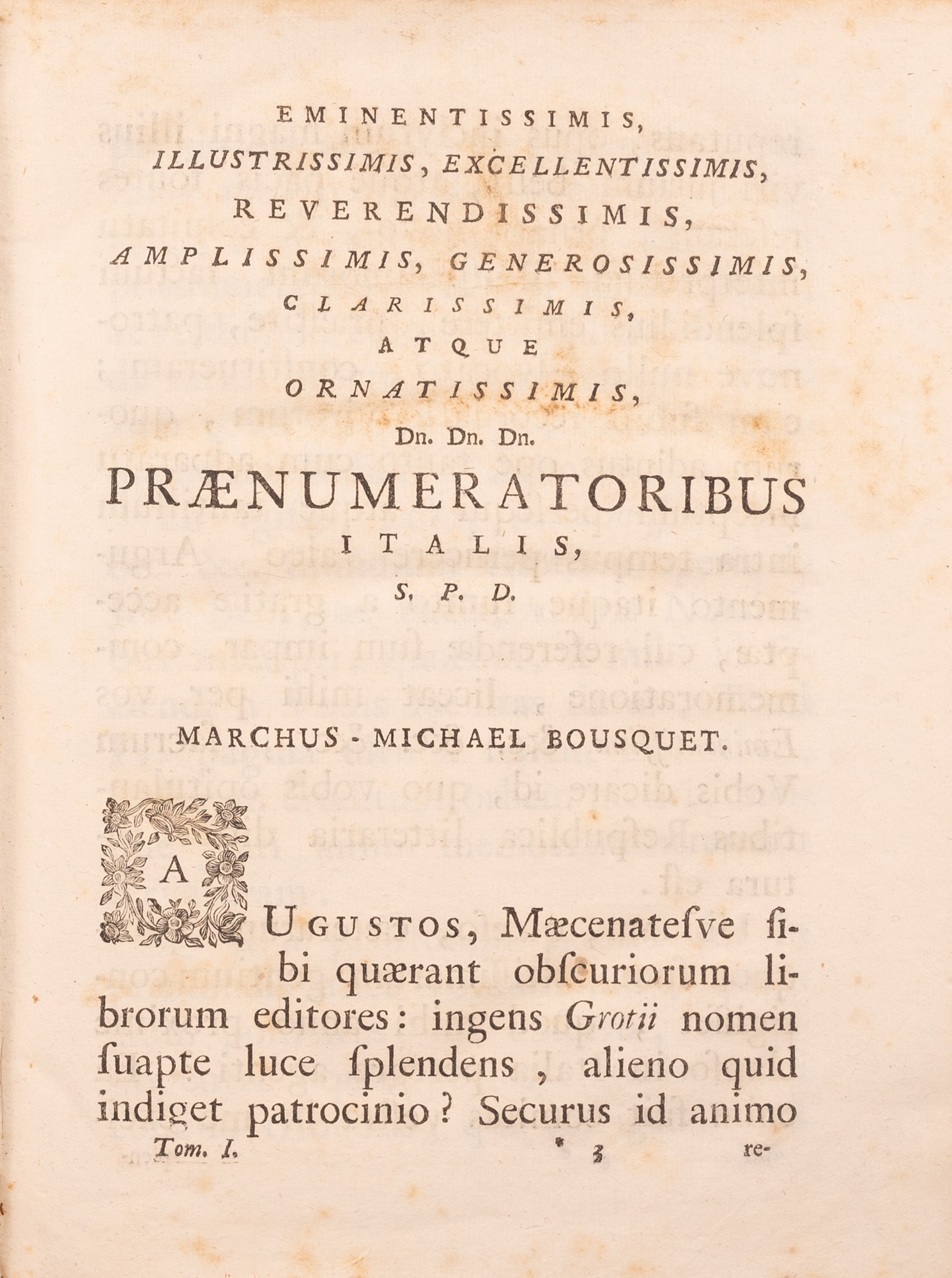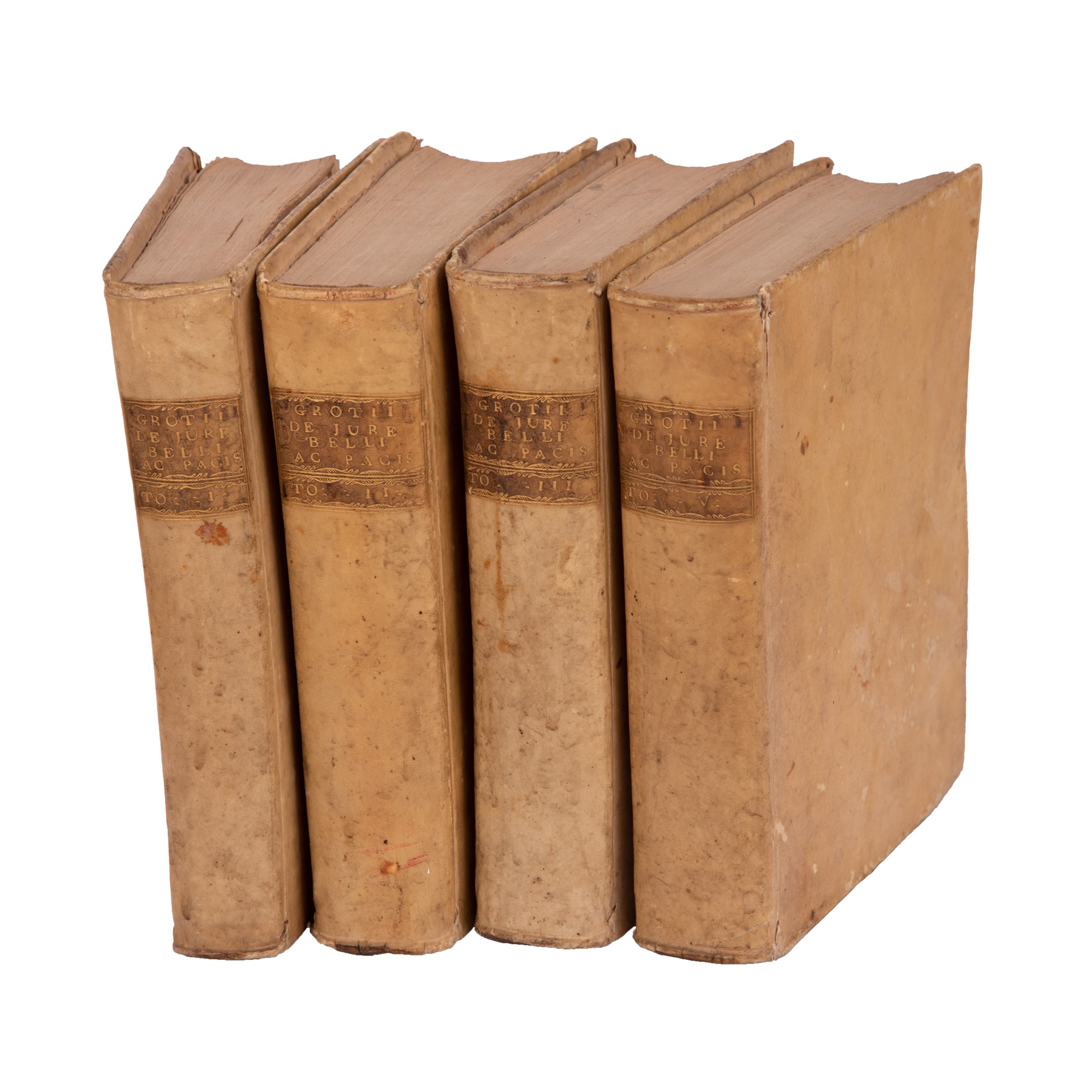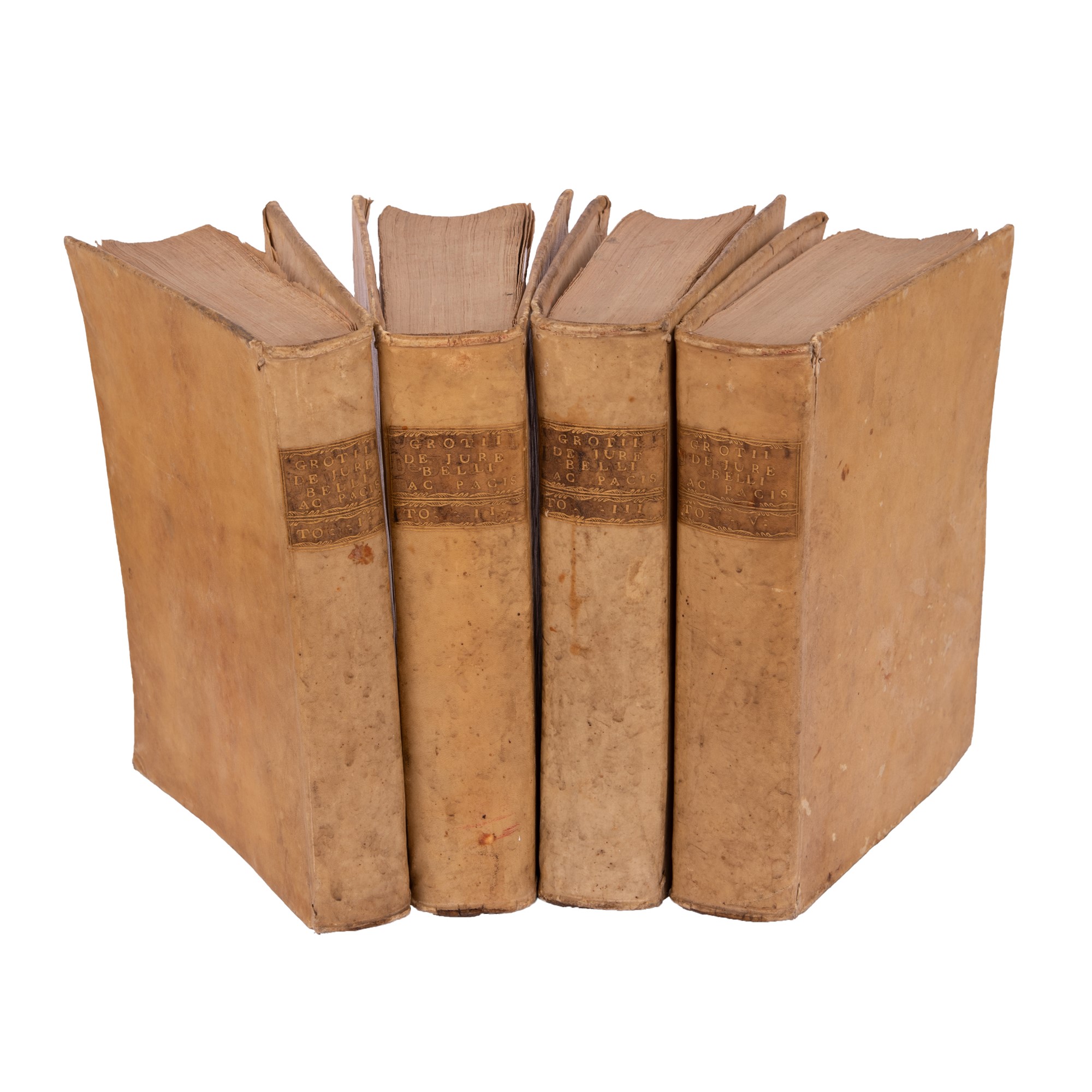 5 voll. in 8 (cm 20 x 26), pp. LXIII + 396 con antiporta incisa raffigurante Grozio; 731 + (1); 689 + (1) con antiporta incisa con ritratto di De Cocceio; 638; XX + 703. Alcune pagine si presentano brunite, fioriture sparse in qualche pagina ma sporadiche. Legatura coeva in piena pergamena con tasselli al dorso, qualche lieve spellatura ai tagli dei piatti. Edizione settecentesca di Losanna (edizione originale 1625) dell'opera principale di Grotius arricchita per la prima volta dalle Osservazioni di Samuel von Cocceji.