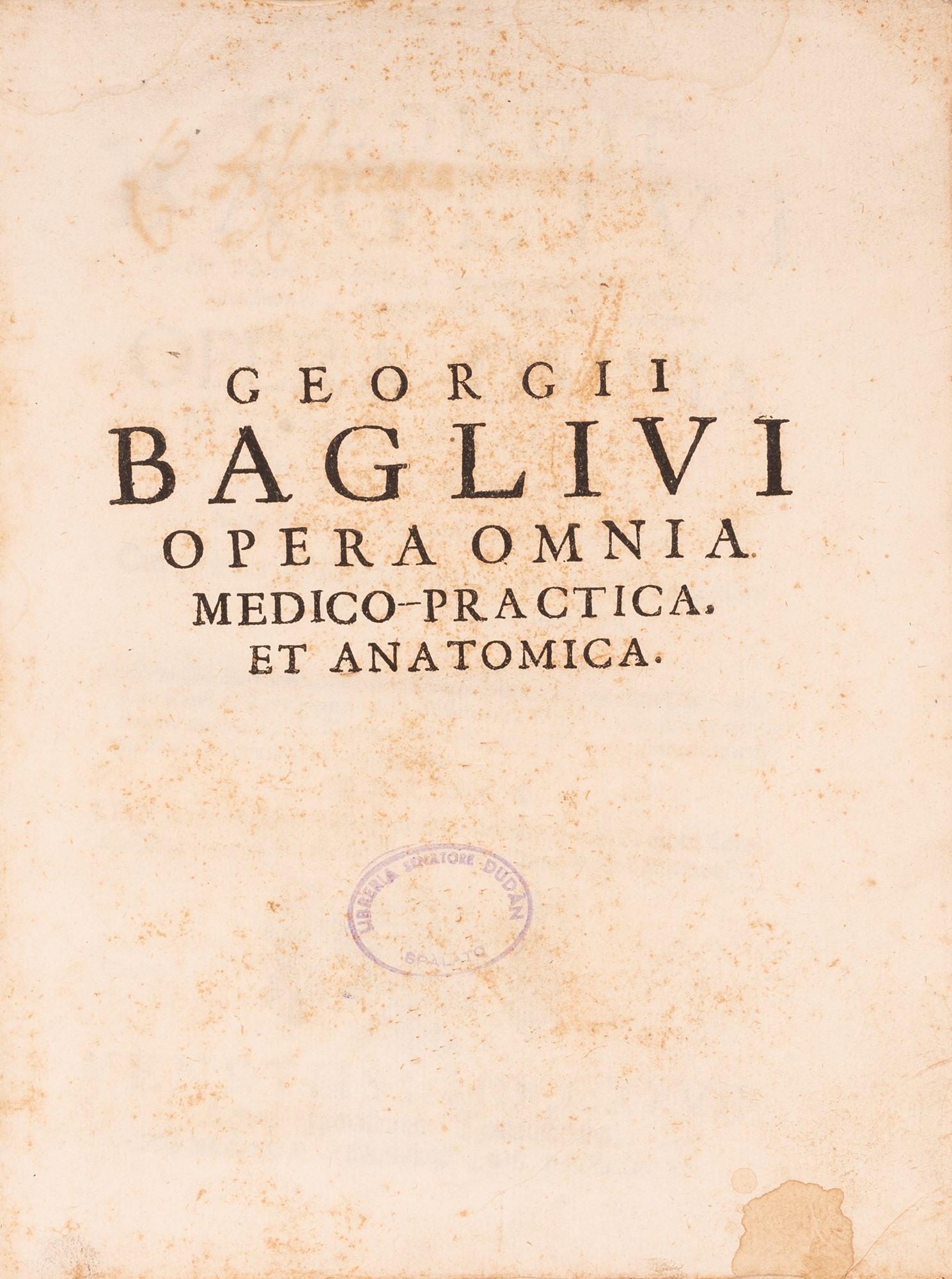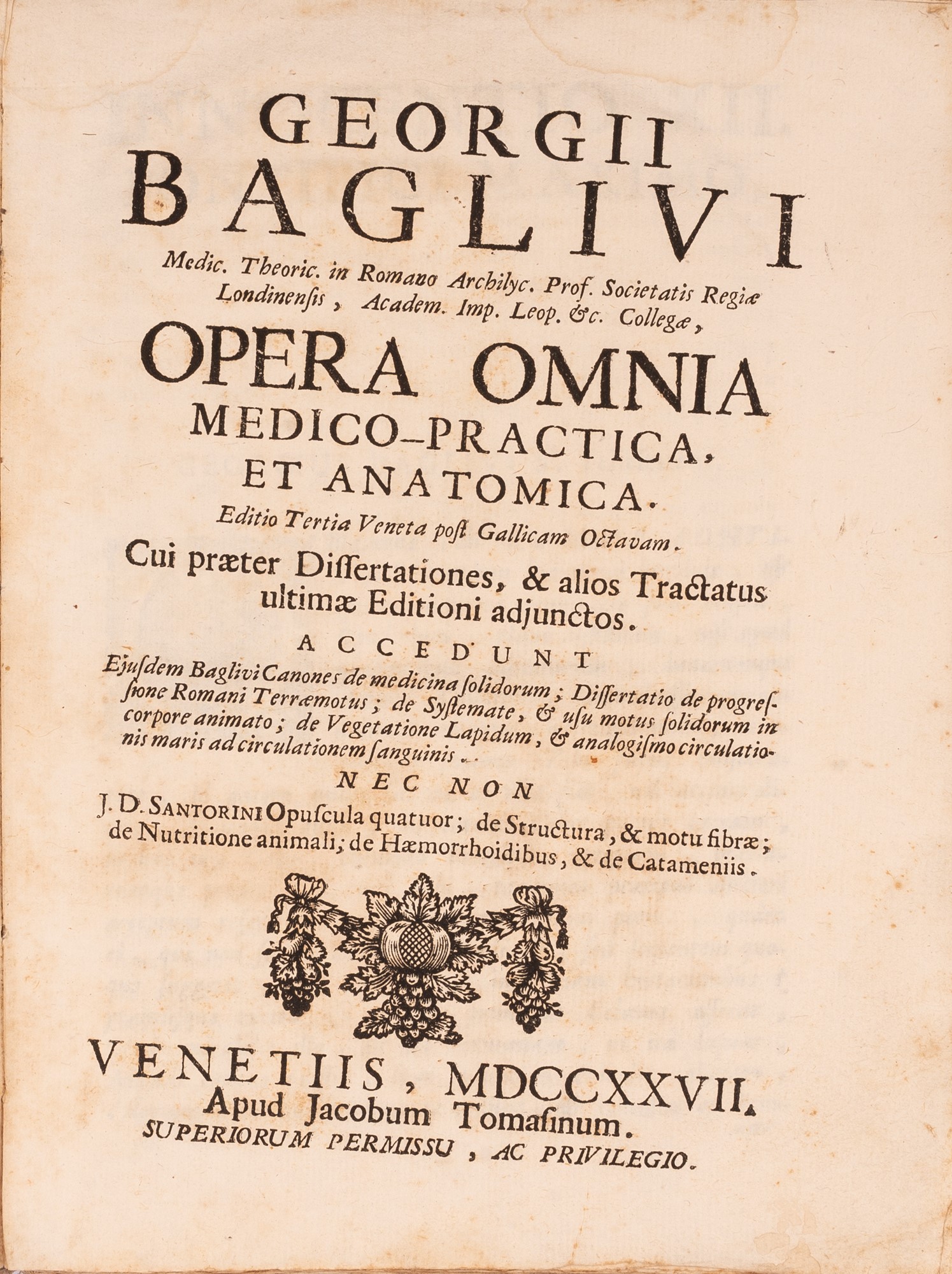 - Georgii Baglivi ... Opera omnia medico-practica, et anatomica. - Editio prima Veneta post Gallicam octavam. Cui praeter Dissertationes, & alios Tractatus ultimae Editioni adjunctos Accedunt ejusdem Baglivi Canones de medicina solidorum; Dissertatio de progressione Romani Terraemotus ... nec non J.D. Santorini Opuscola quatuor ... - Venetiis : apud Jacobum Tomasinum, 1716.